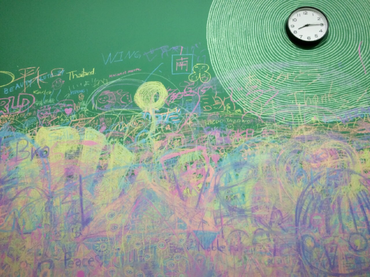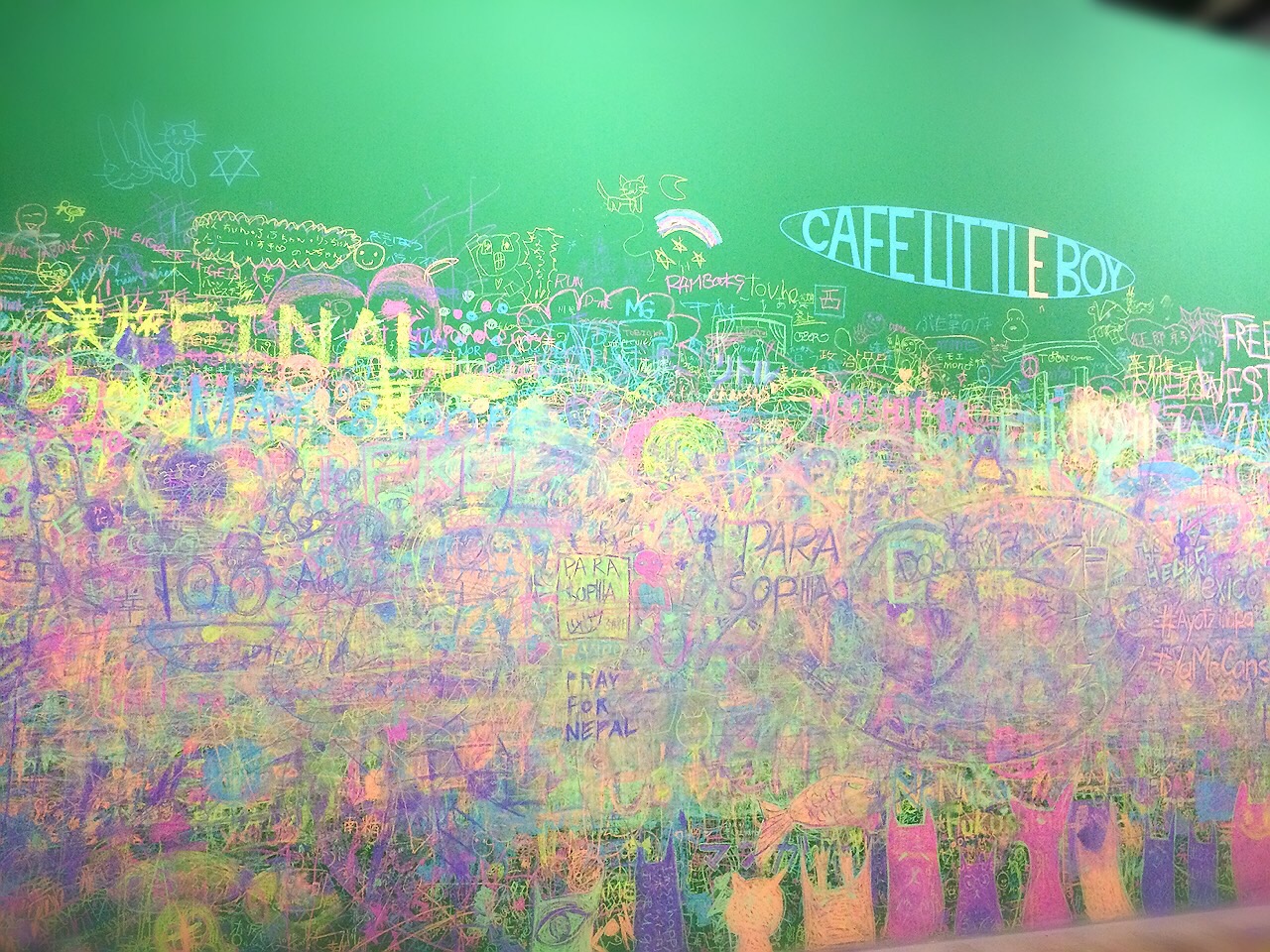 地下鉄の東山で降りて、京都市美術館で一日券を購入しました。京都市美術館の中に入ると、フランスのJean-Luc Vilmouth氏の≪ cafe little boy ≫という作品があり、鑑賞者は壁紙や机に色とりどりのチョークでメッセージを書き込むことができるとのことで、私も何ヶ所か書きました♪