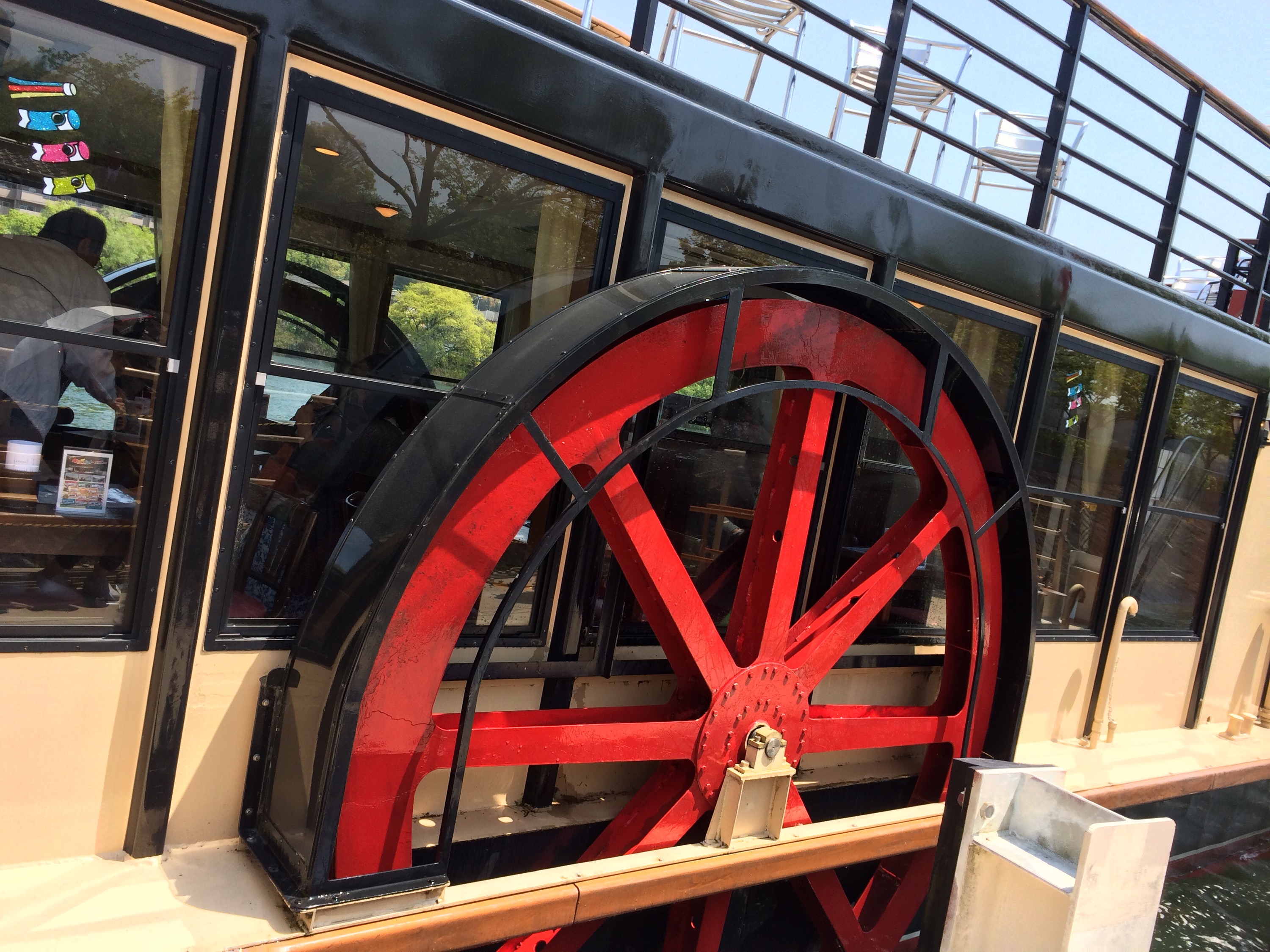 黒と赤の大きな車輪のようなものが付いている船でした。