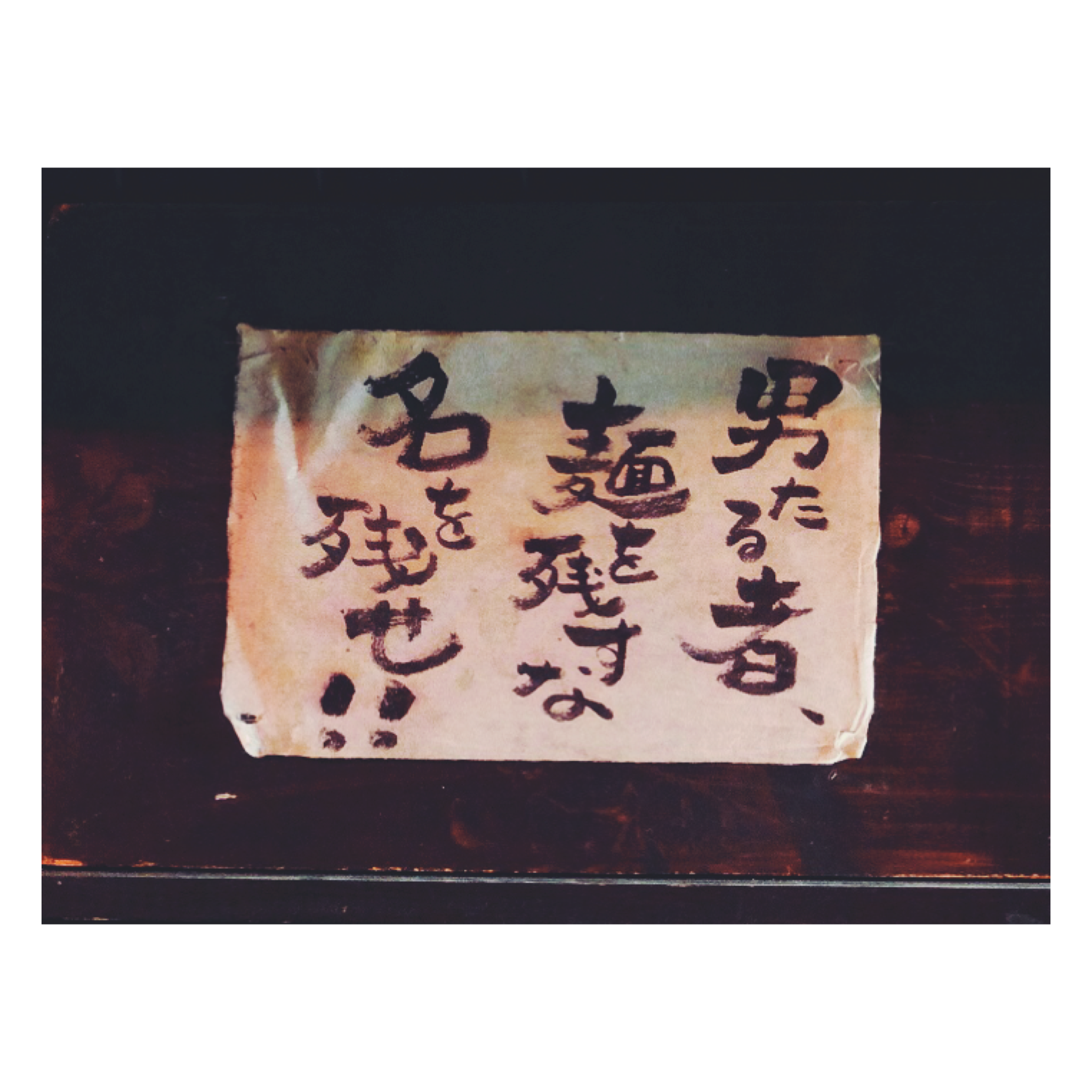 カウンターに案内されましたが、目の前の紙に「男たる者、麺を残すな 名を残せ!」と書いてあり、なんだか印象的でした笑
