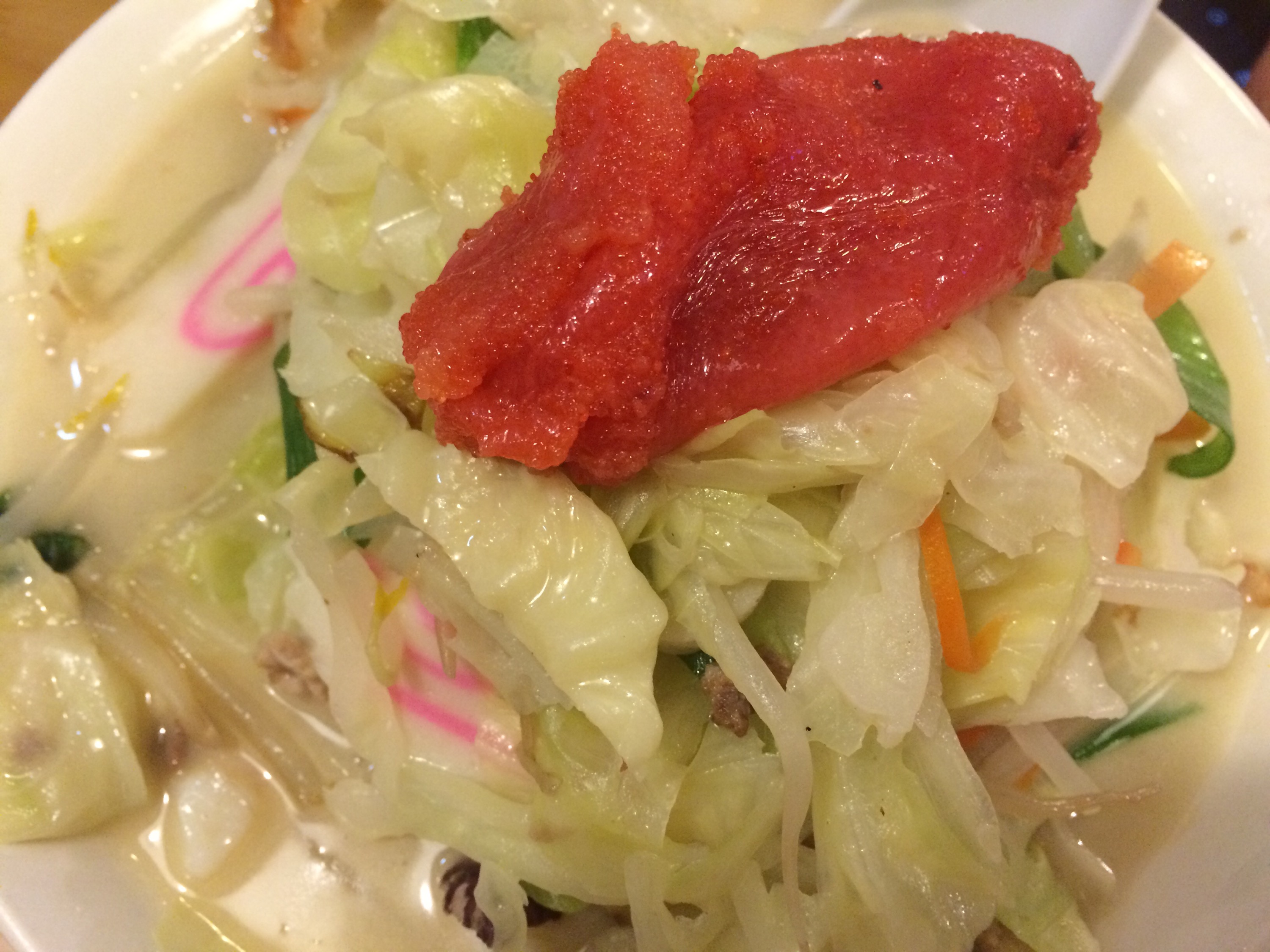 友人がオーダーしていた明太子ちゃんぽんには上に明太子がドカンと乗っておりとっても美味しそうでした。
