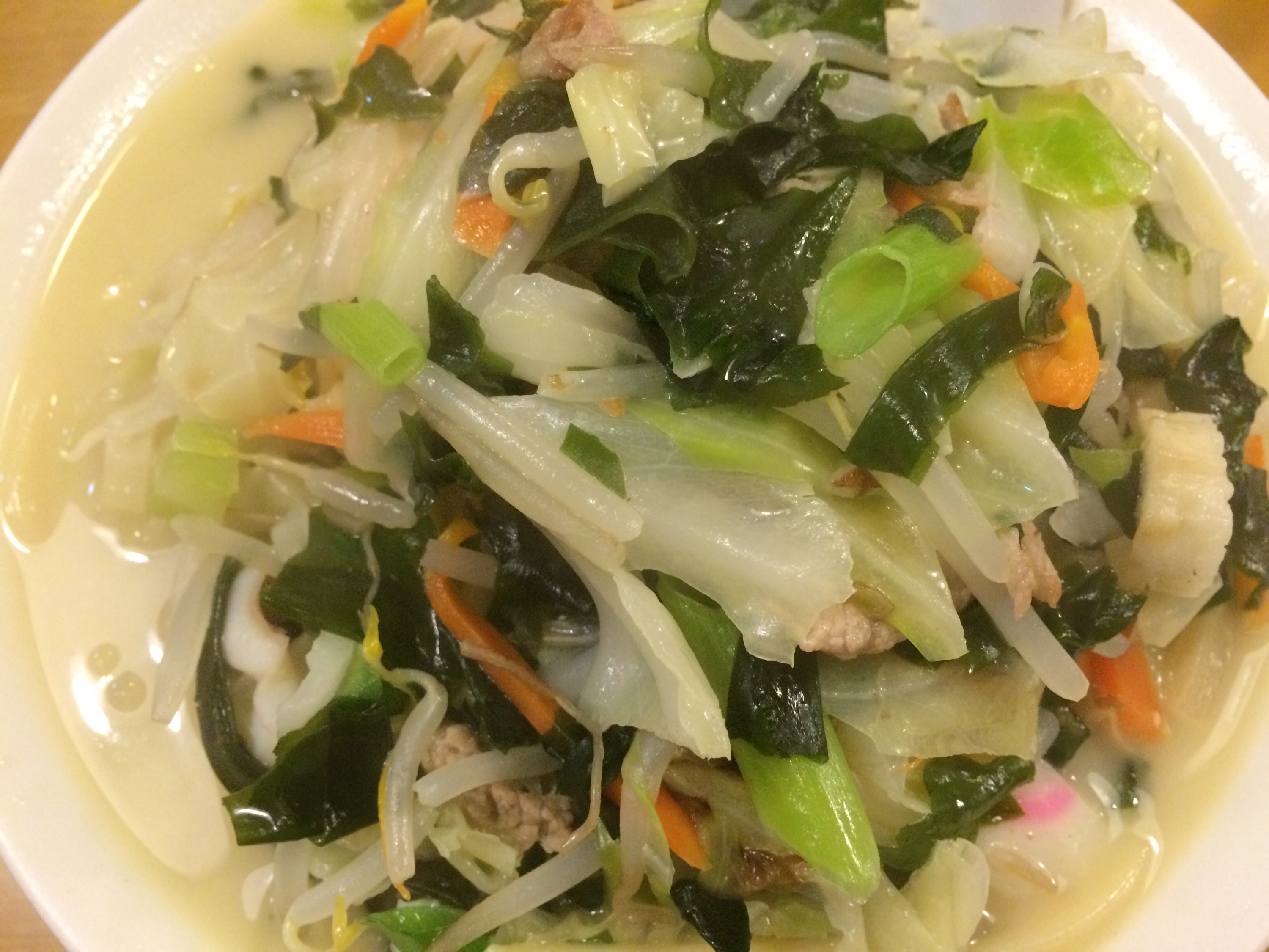 わかめとお野菜たっぷりのちゃんぽんです。写真ではわかりにくですがかなりの量でびっくりするぐらいでした。