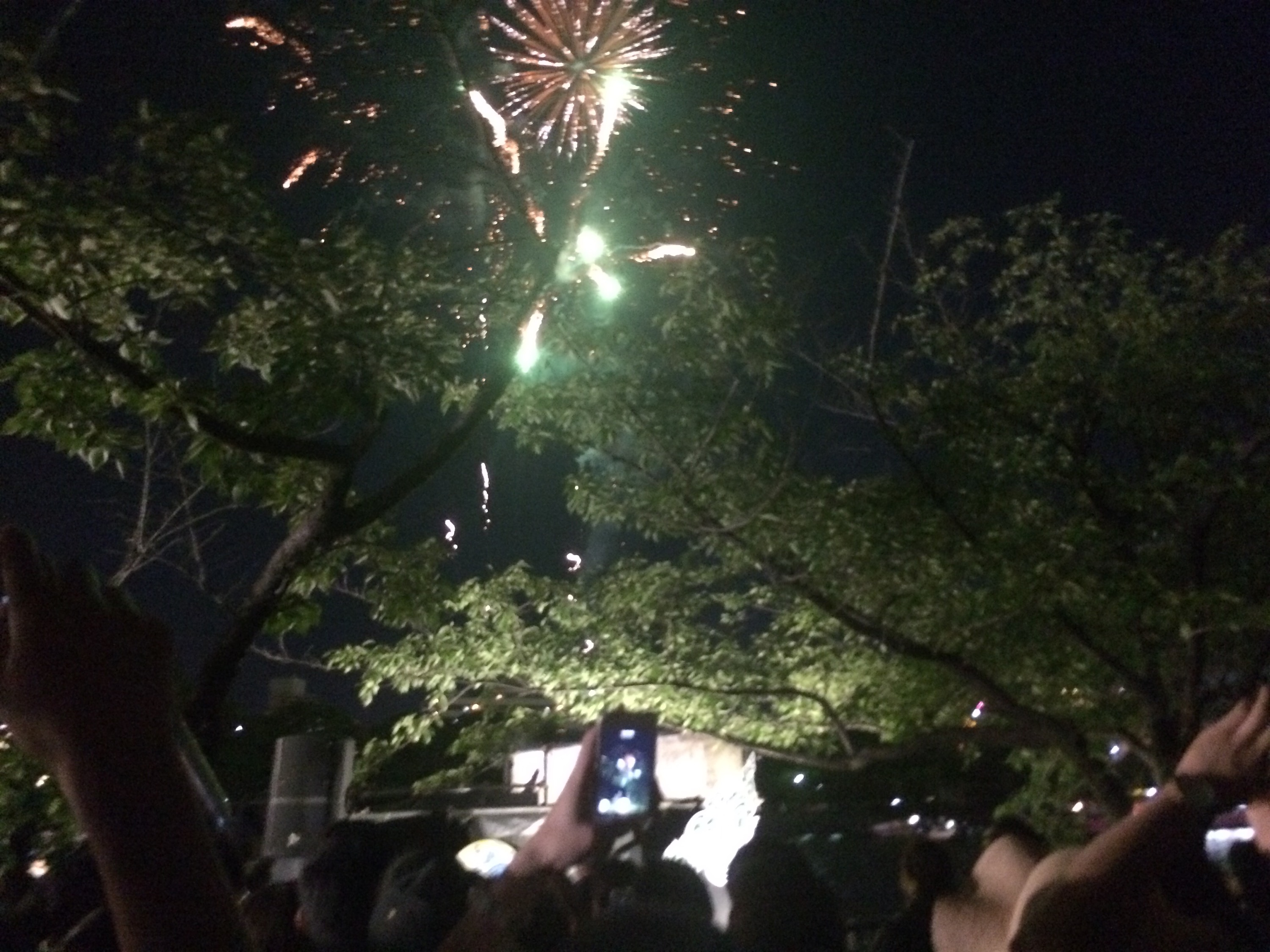 川沿いに到着すると、すでに人で埋め尽くされていて、行き場がありませんでした。肝心の花火ですが、19時頃から21時頃までの間、川崎公園・桜宮公園の二地点から、打上げ花火を中心に約4000発の花火が奉納されるようで、川沿いから見える花火はほんとに少しで(木の間からやっと見えるような感じ)、人の多さと屋台を楽しもうと思えました!