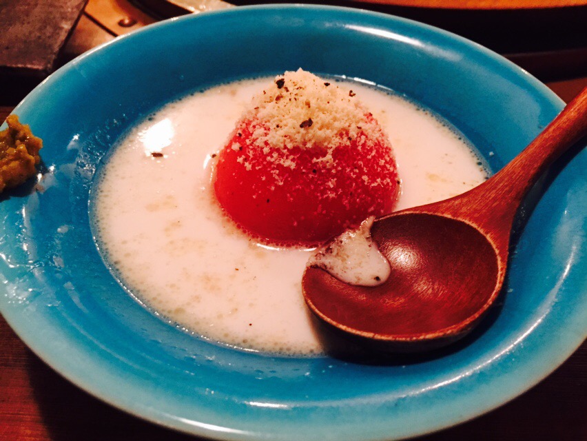 夏のお野菜、トマトさんです。トマトのおでんなんて初めてたべました!少し洋風にアレンジされており、上には粉チーズが振りかけてありました。こちらも美味しかったです!