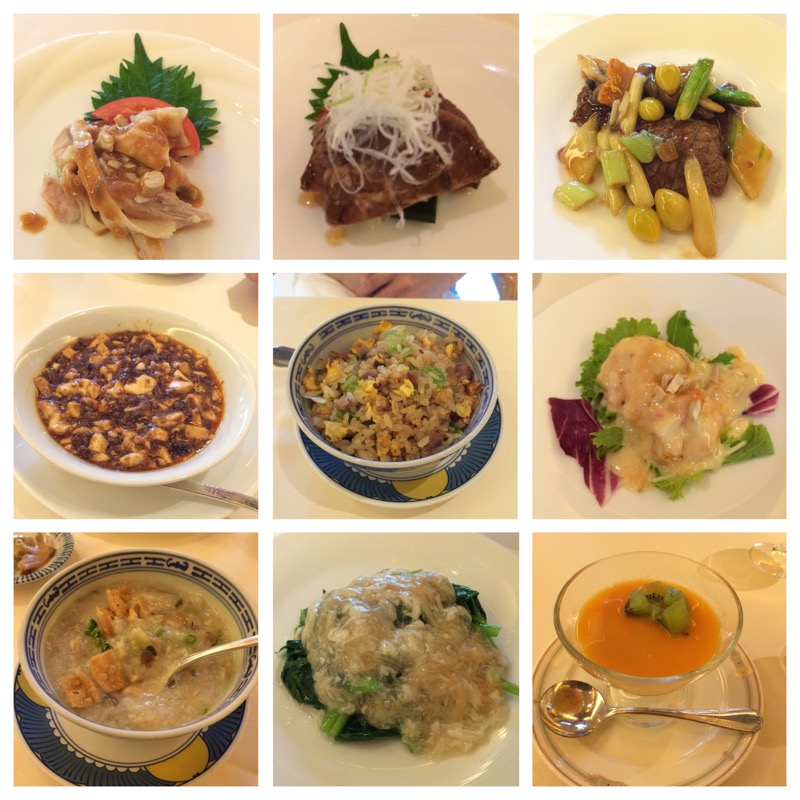 今回は注文したのは、蒸し鶏の細切り胡麻ソース、冷製近江牛の香草風味煮 チャイナピクルス添え、温野菜の干し貝柱餡、麻婆豆腐、海老のホットマヨネーズ、国産牛肉薄切りのオイスターソース炒め、中華粥、チャーハン、マンゴープリン