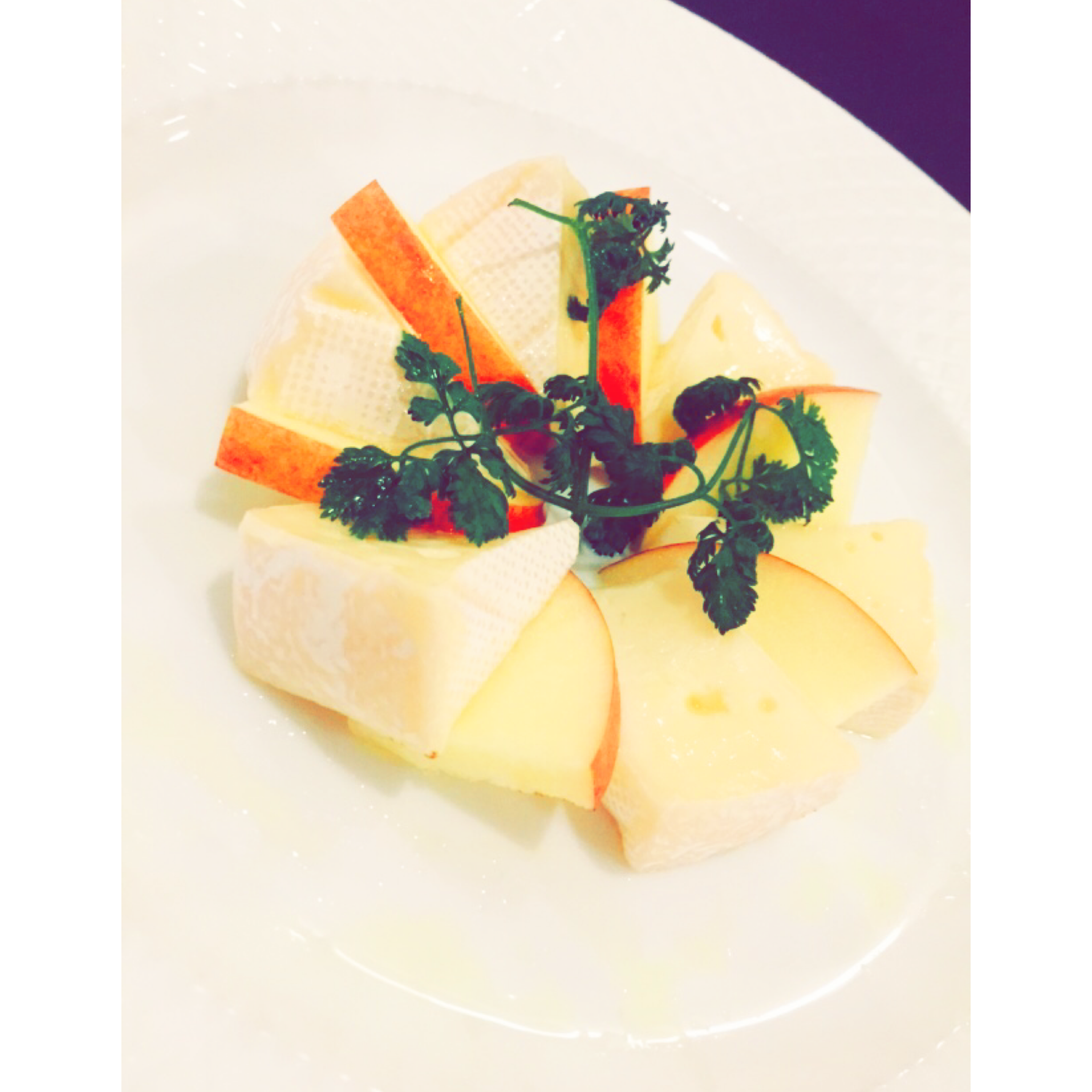 まず、林檎とカマンベールチーズをいただきました。火のついたお酒を上からかけてもらい、「火が消えてから食べてください」と言われました。チーズ大好きな私は、初っ端からテンションの上がるお料理でした。