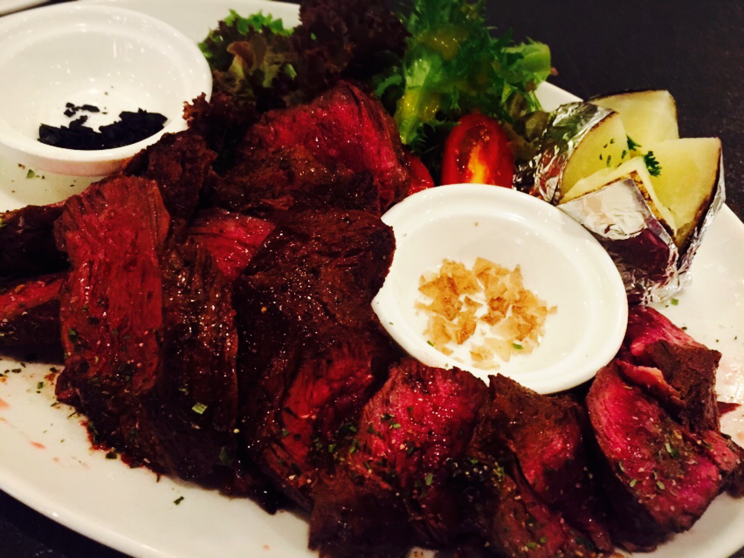 こちら400gのなんちゃらステーキなんですか、「なんちゃら」の部分忘れてしまいました、食べるのに必死で...。2人で食べていたんですが、結構なお肉の量でした。ですがかなり!満足できます。