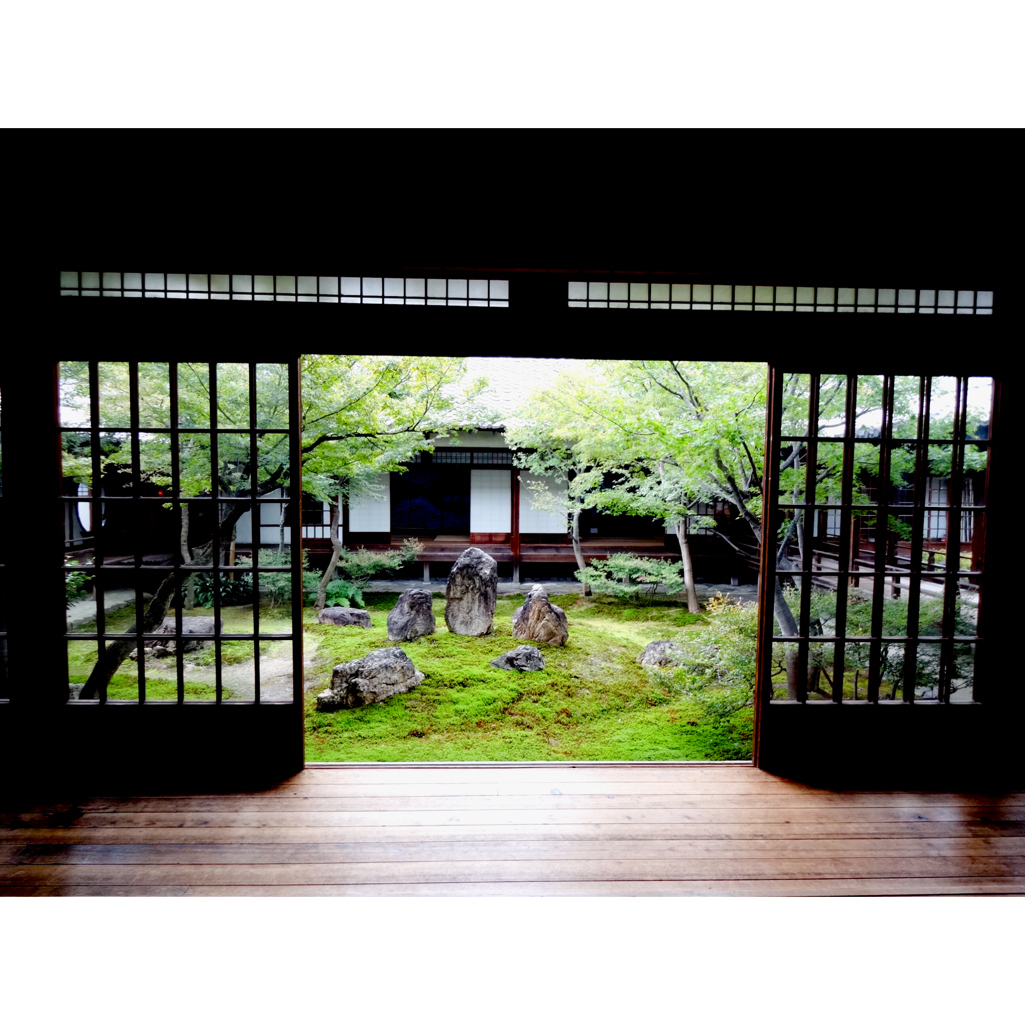 建仁寺本坊中庭にある潮音庭は、中央に三尊石、その東には坐禅石、回りに紅葉を配した枯淡な四方正面の禅庭。
