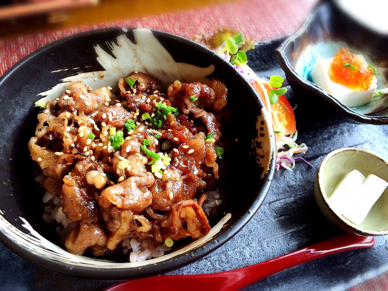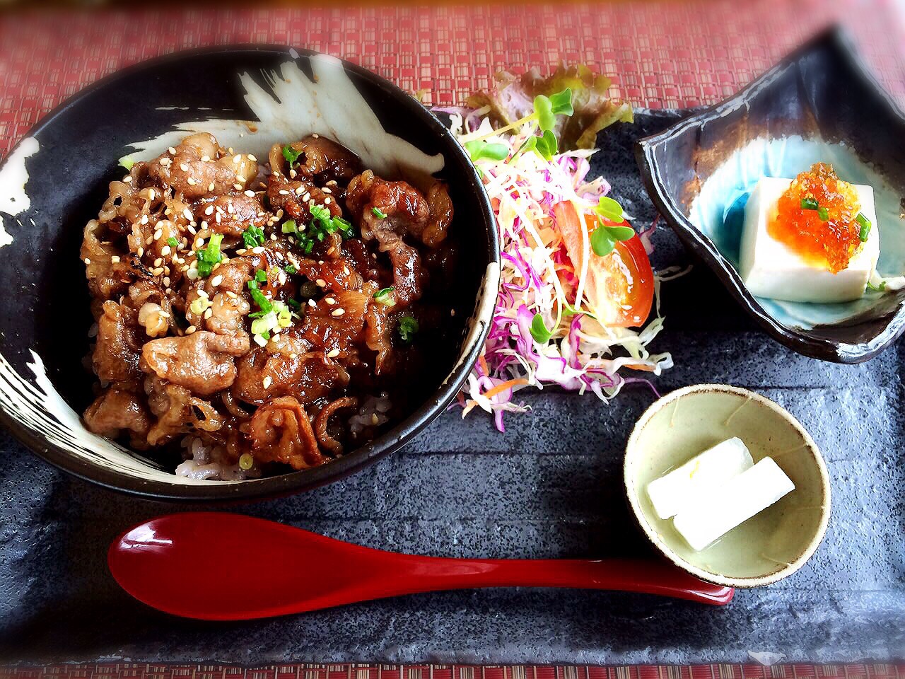 伊賀牛焼き丼が運ばれてきました!ご飯は赤米のもち米と伊賀米コシヒカリを使用されているそうでとってもヘルシーなご飯でした!お肉はニンニクが効いていて甘辛くとても美味しかったです。