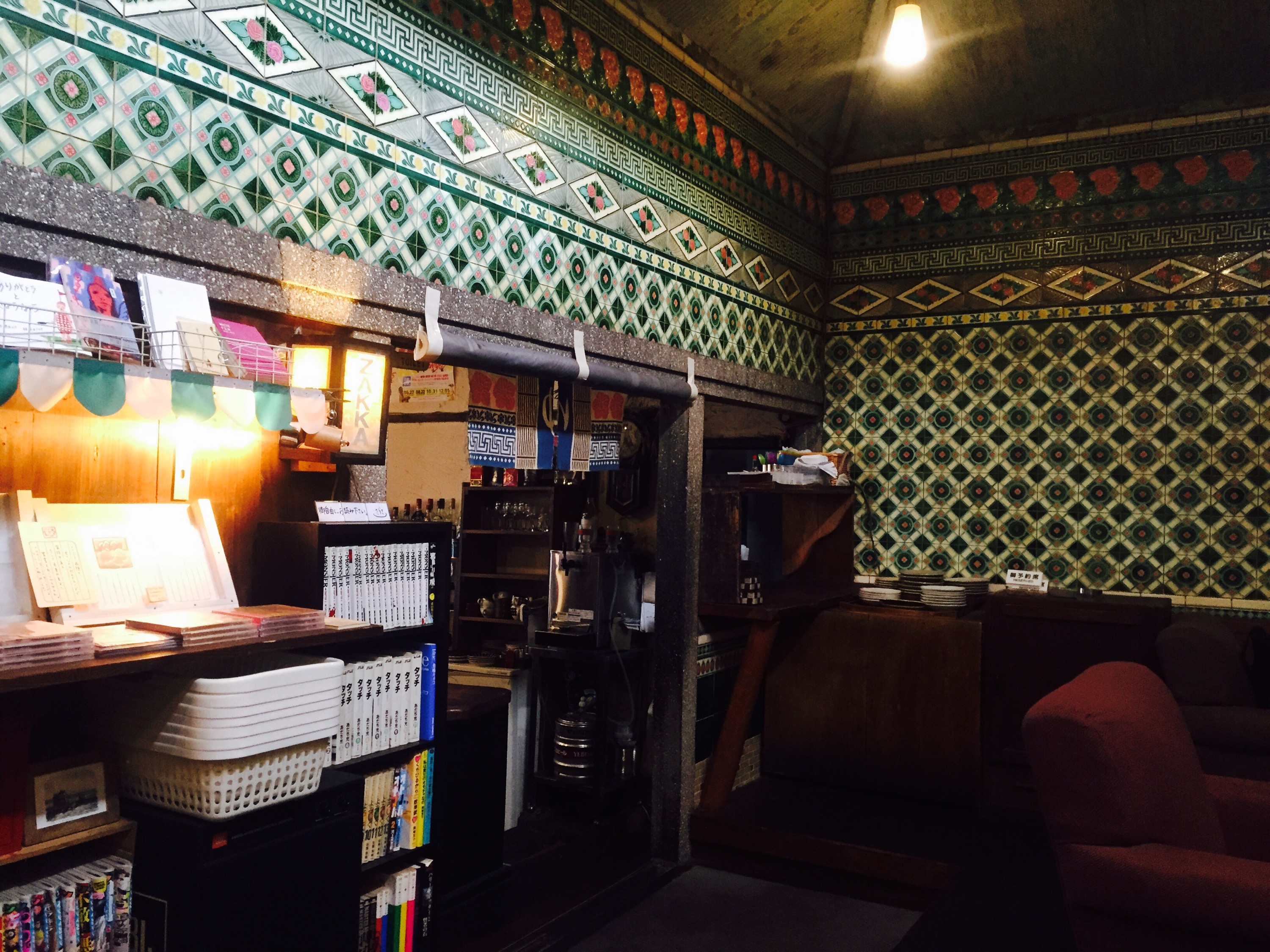 鮮やかな模様のマジョリカタイル(明治末期に西洋建築とともに普及した、表面に凹凸のある装飾タイルだそうです)が張り巡らされたレトロな内装や、脱衣所の天井にある見事な透し彫りの欄間が素敵でした。マジョリカタイルは今では希少なものなのだそうです。