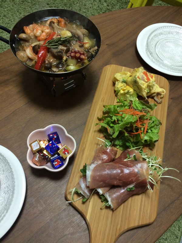 ワインを飲むとリクエストが入ったので、具沢山シーフードのアヒージョ、グリーンサラダ、スパニッシュオムレツ、生ハム などでした。