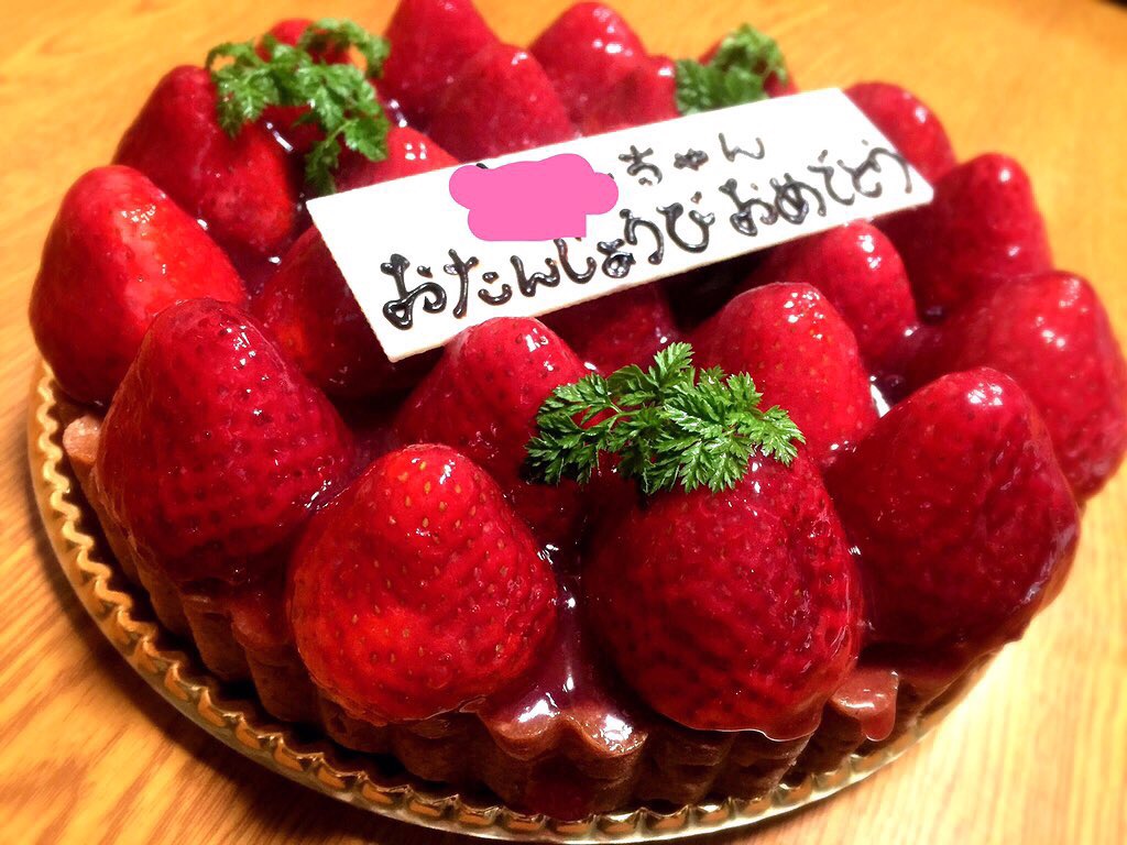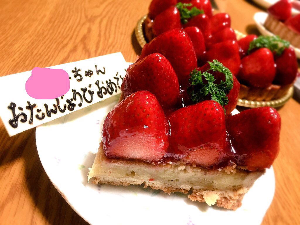 バースデーケーキはいつものごとくパレットさんのイチゴタルトにしてもらいました(*´?`*)上西はケーキの中でもイチゴタルトが世界で一番好きです…