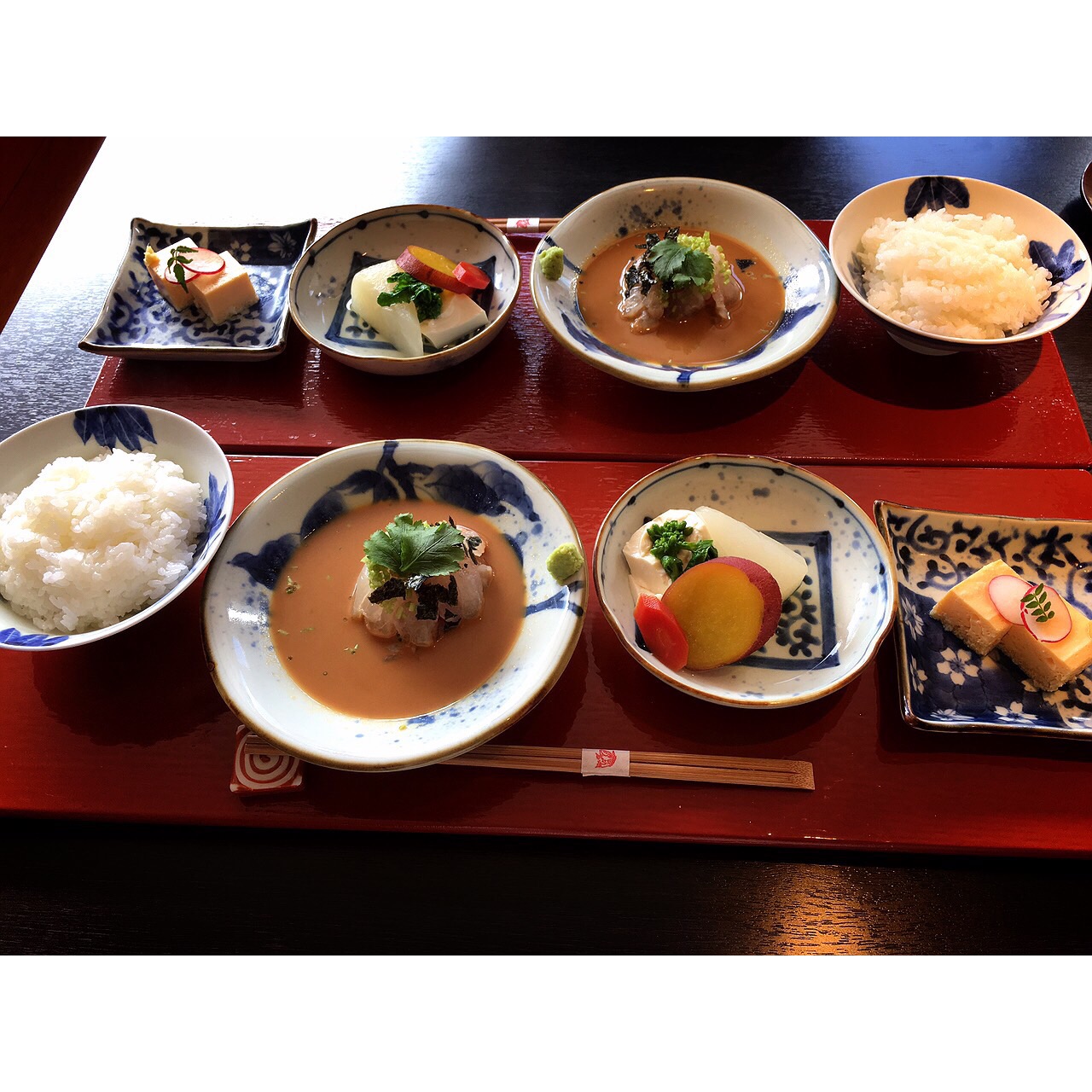 ?店内に案内していただき、おしながきが「鯛茶漬け御膳 2060 」「鯛西京焼御膳 2060」そして両方楽しめる限定の「HANANA御膳 3090」でしたので、鯛茶漬け御膳を注文しました!?