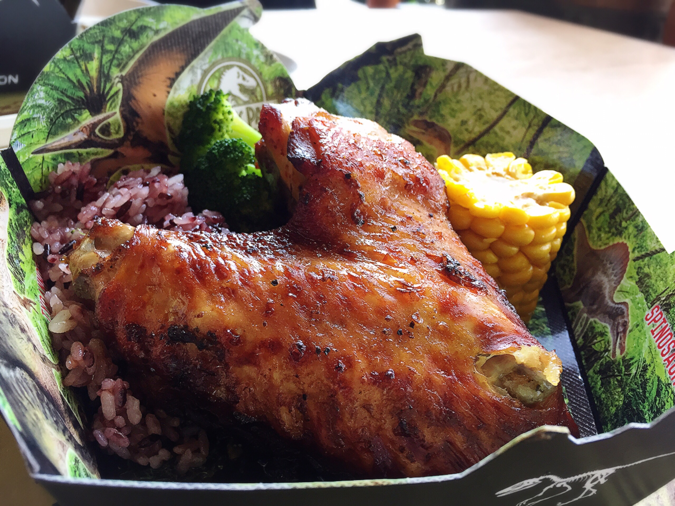 そしてお昼ご飯は、恐竜の翼の部分を焼いたという設定の鶏肉を頂くことにしました。注文を聞いてくれたスタッフのお兄さんが「今から狩ってきます!!」と言って用意してくれました。