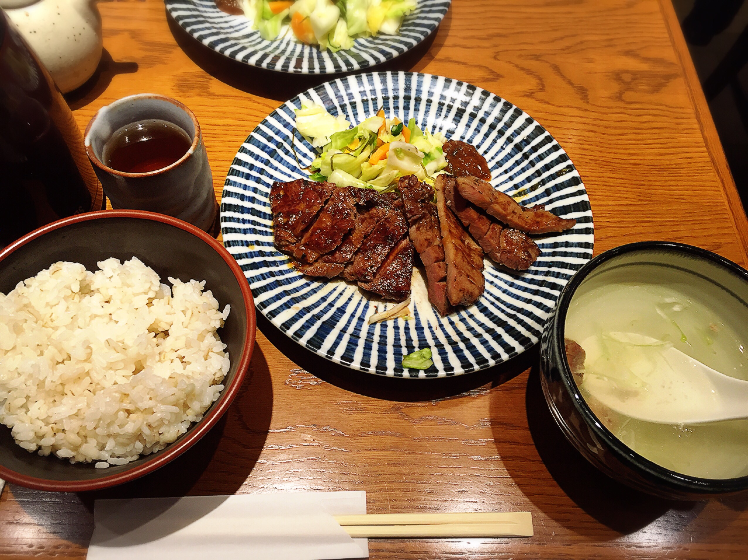中に入ってメニューを見ると「牛ロースと牛たん定食」という欲張りには嬉しいものがありました。迷わずにこれを注文しました。