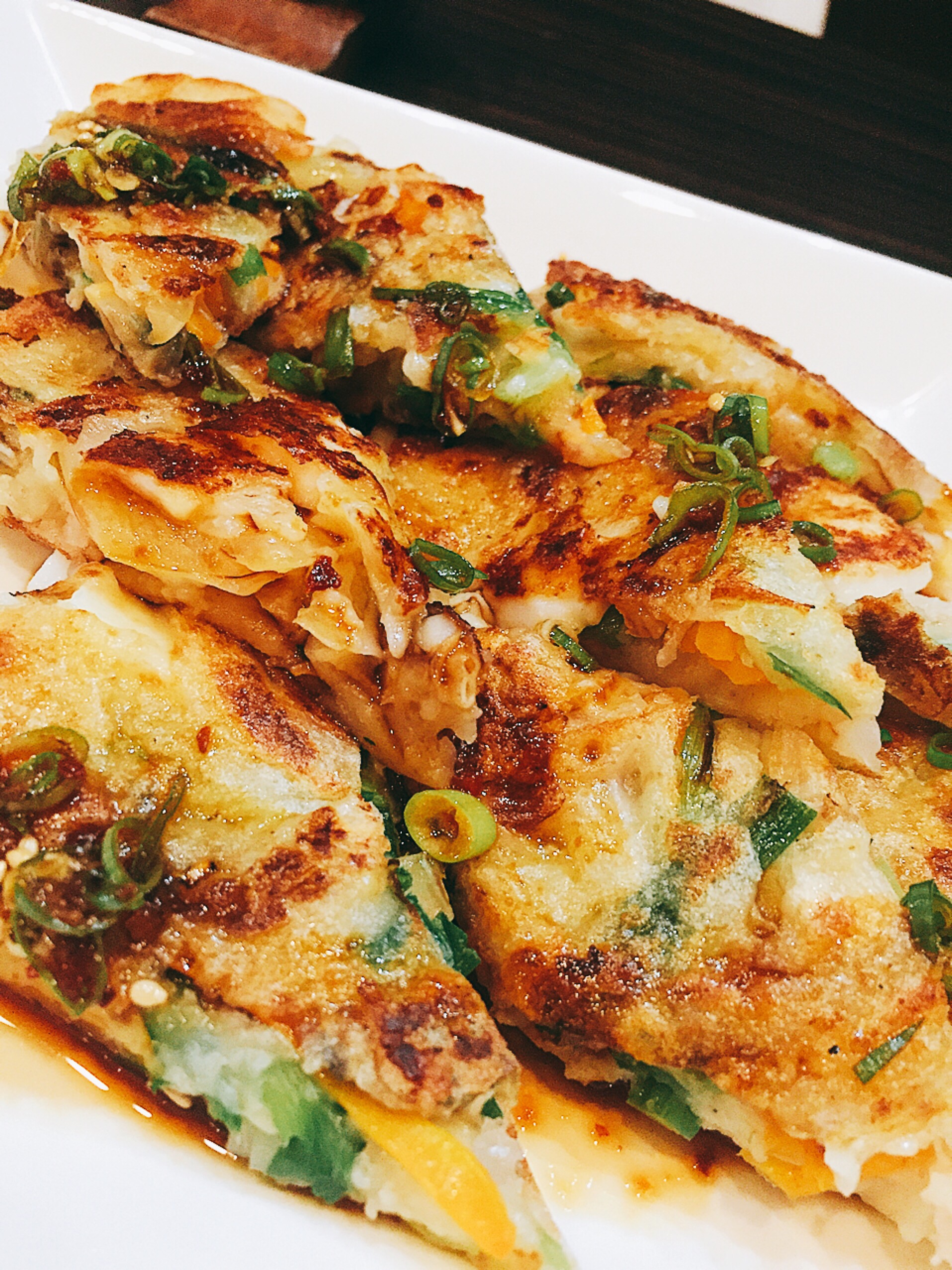 チヂミは、じゃがいもの生地にニラとか海鮮を入れて焼いた薄いお好み焼きみたいなものです。タレにつけて食べるんですが、このタレがめっちゃおいしかったです (`・ω・´)