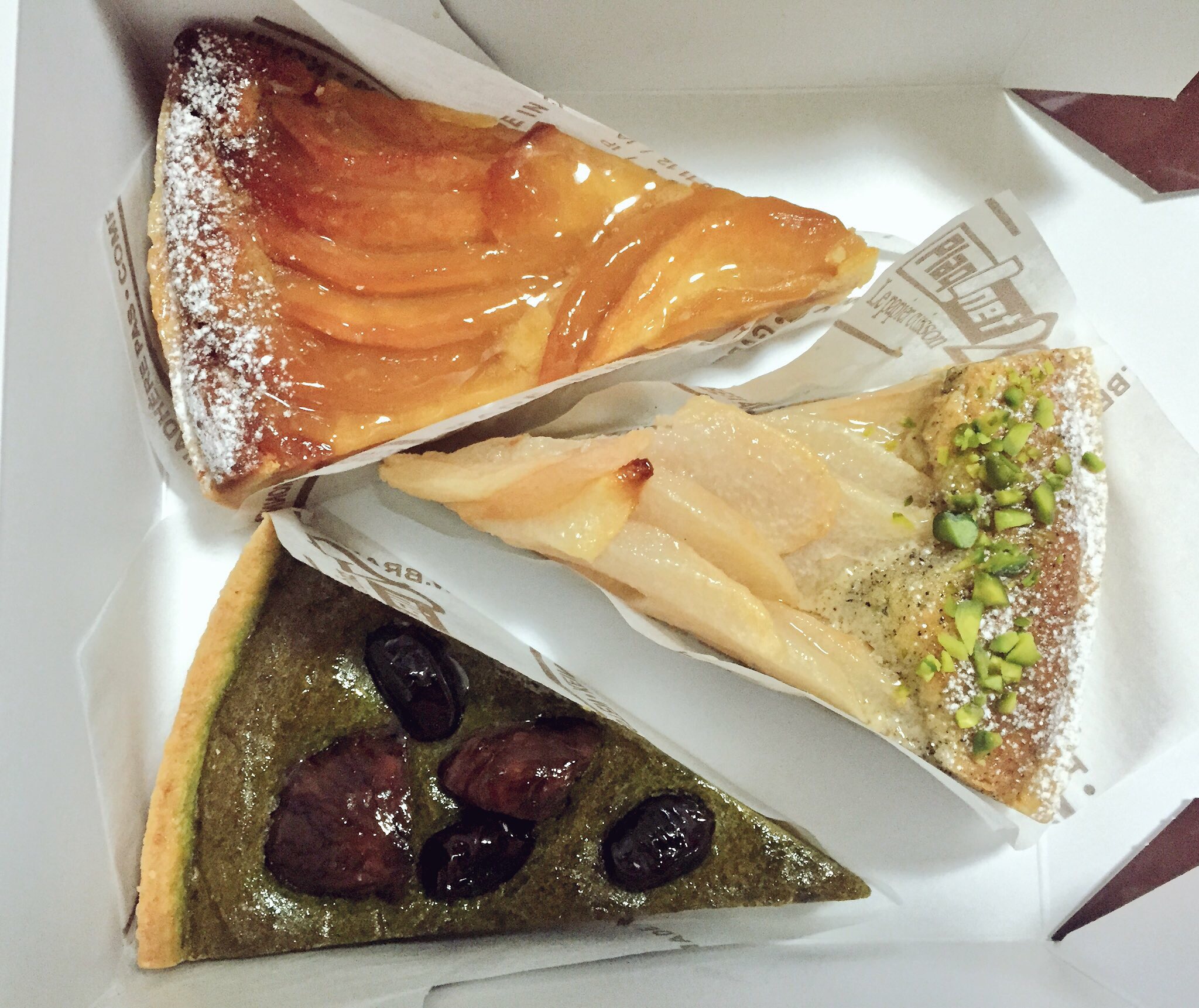 上から紅玉りんごのタルト、和梨のタルト、黒豆と渋皮栗のタルトです。