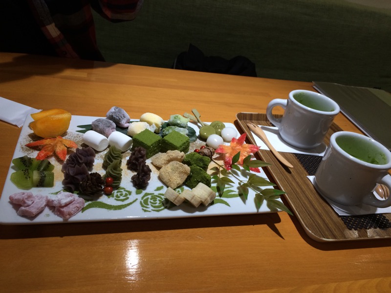 白玉団子、抹茶ケーキ、3種のアイスの求肥包み、わらび餅、マシュマロ、3種のあんこ、フルーツがとても綺麗に並べられていて、食べるのが勿体くらいでした。