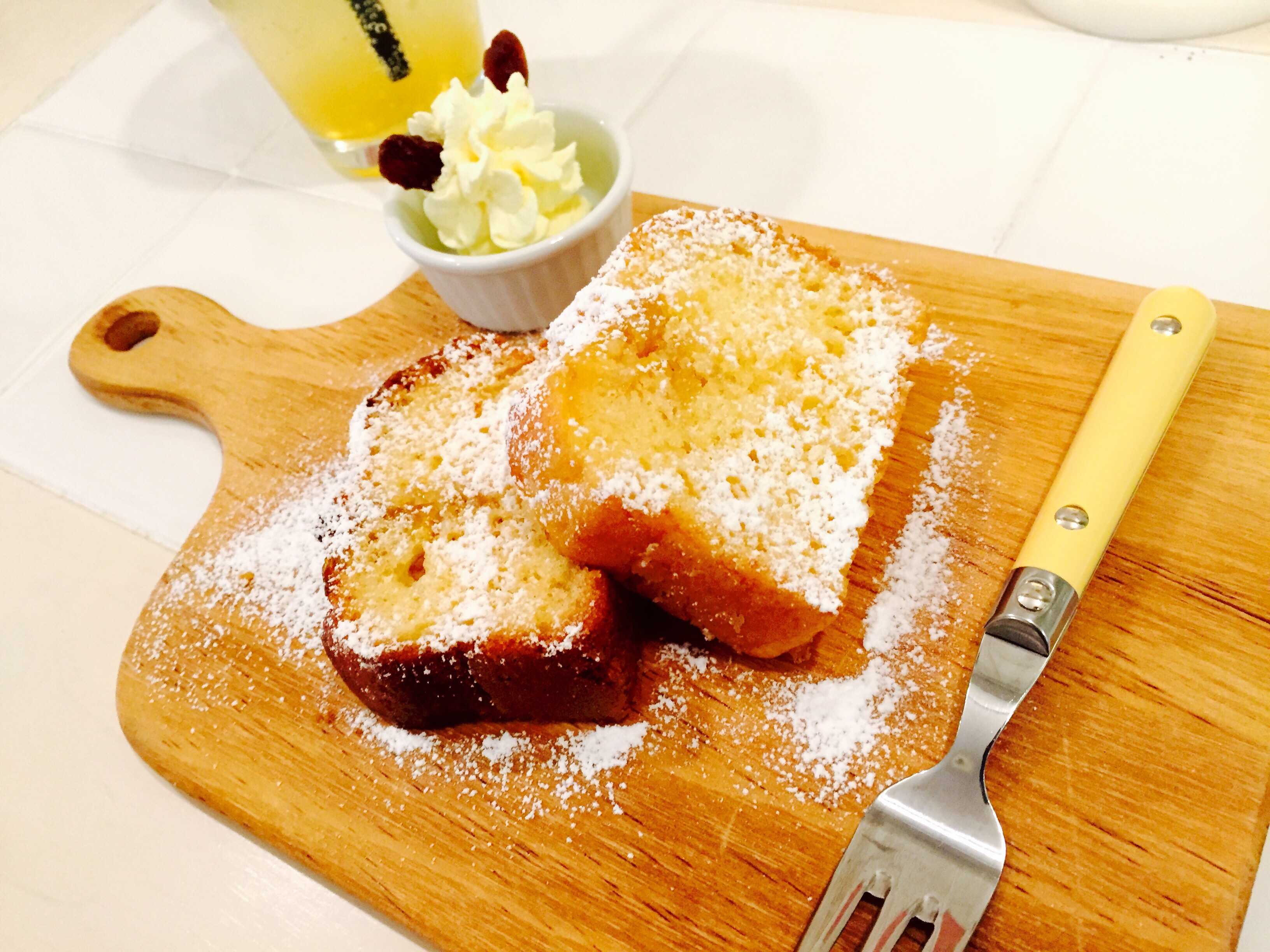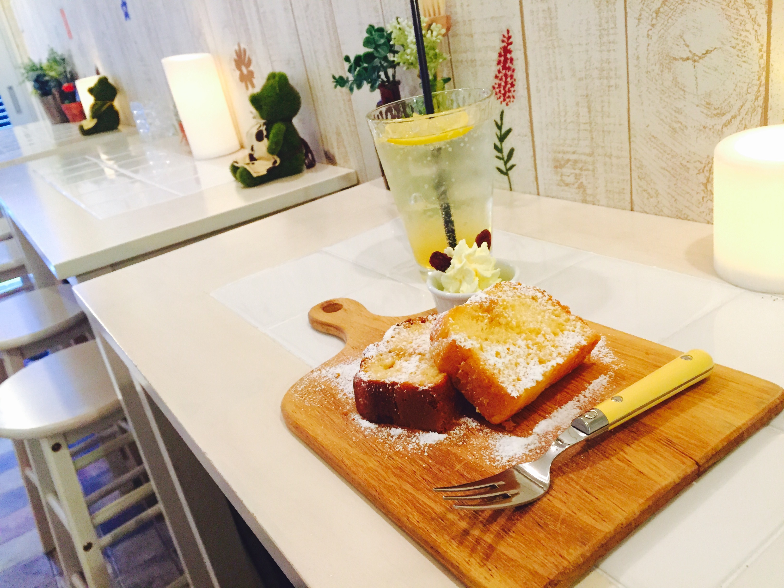 まずは蜂蜜レモンソーダ、蜂蜜漬レモンピールトッピングの豆乳&蜂蜜のパウンドケーキをいただきました🐝??