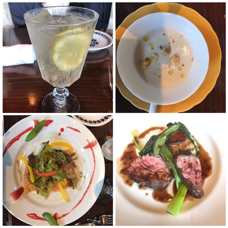 この日は新玉ねぎの冷製スープ、2種から選びべる前菜(お肉系とお魚系)、3種から選ぶメイン(お魚、牛肉、鶏肉)