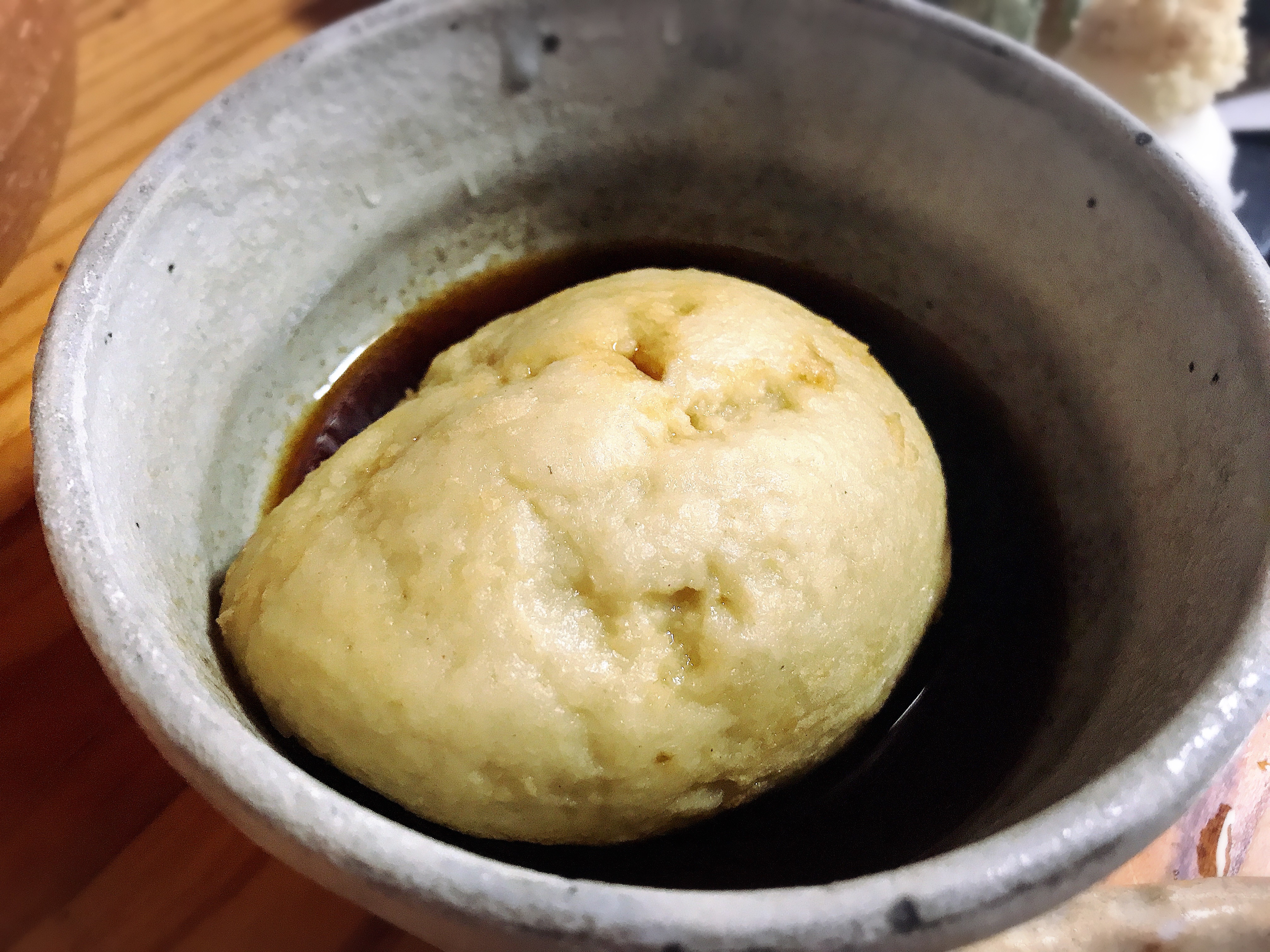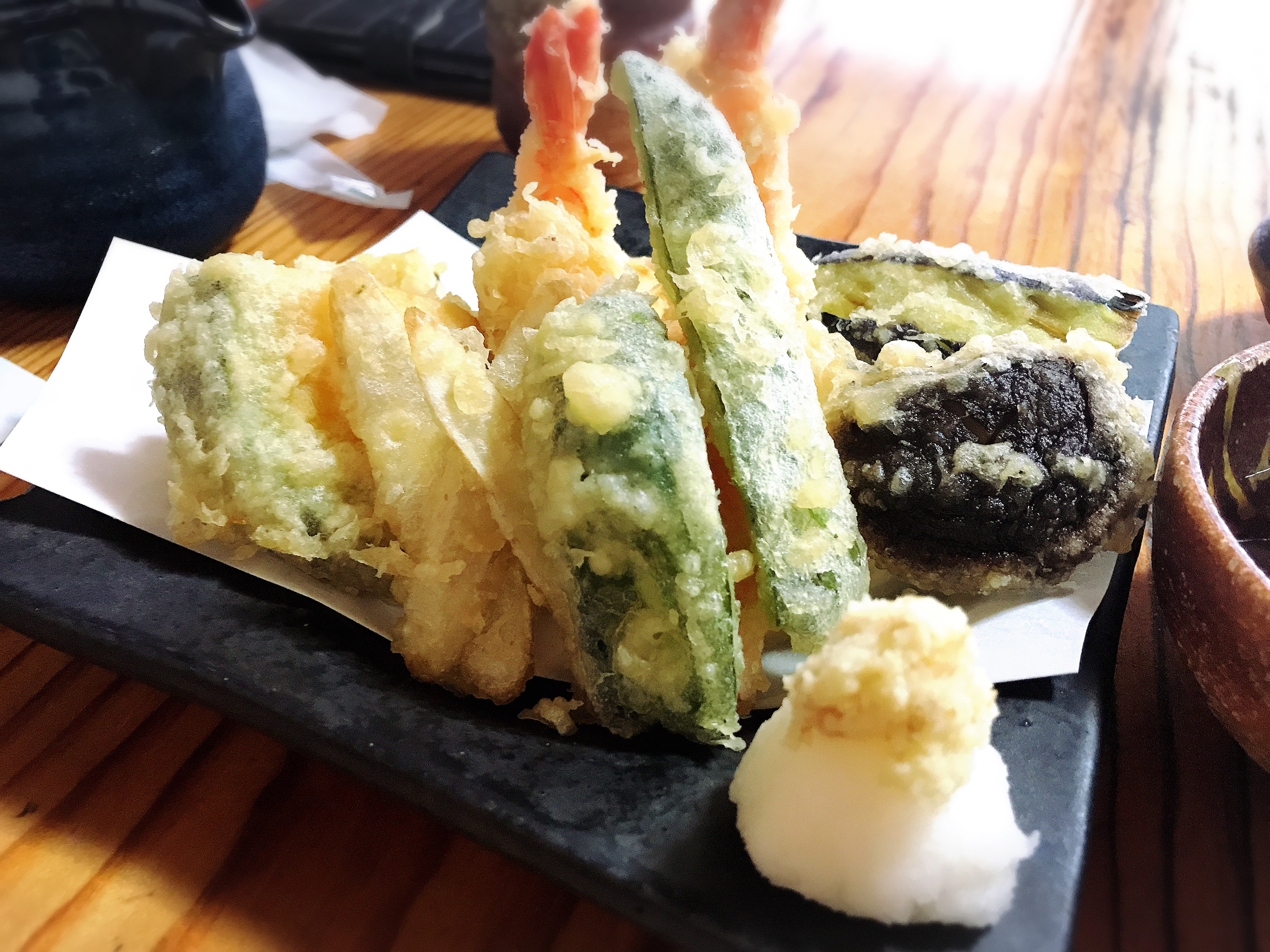 考えに考えて、もりそば、天ぷら盛り合わせ、そばがきを注文しました。
