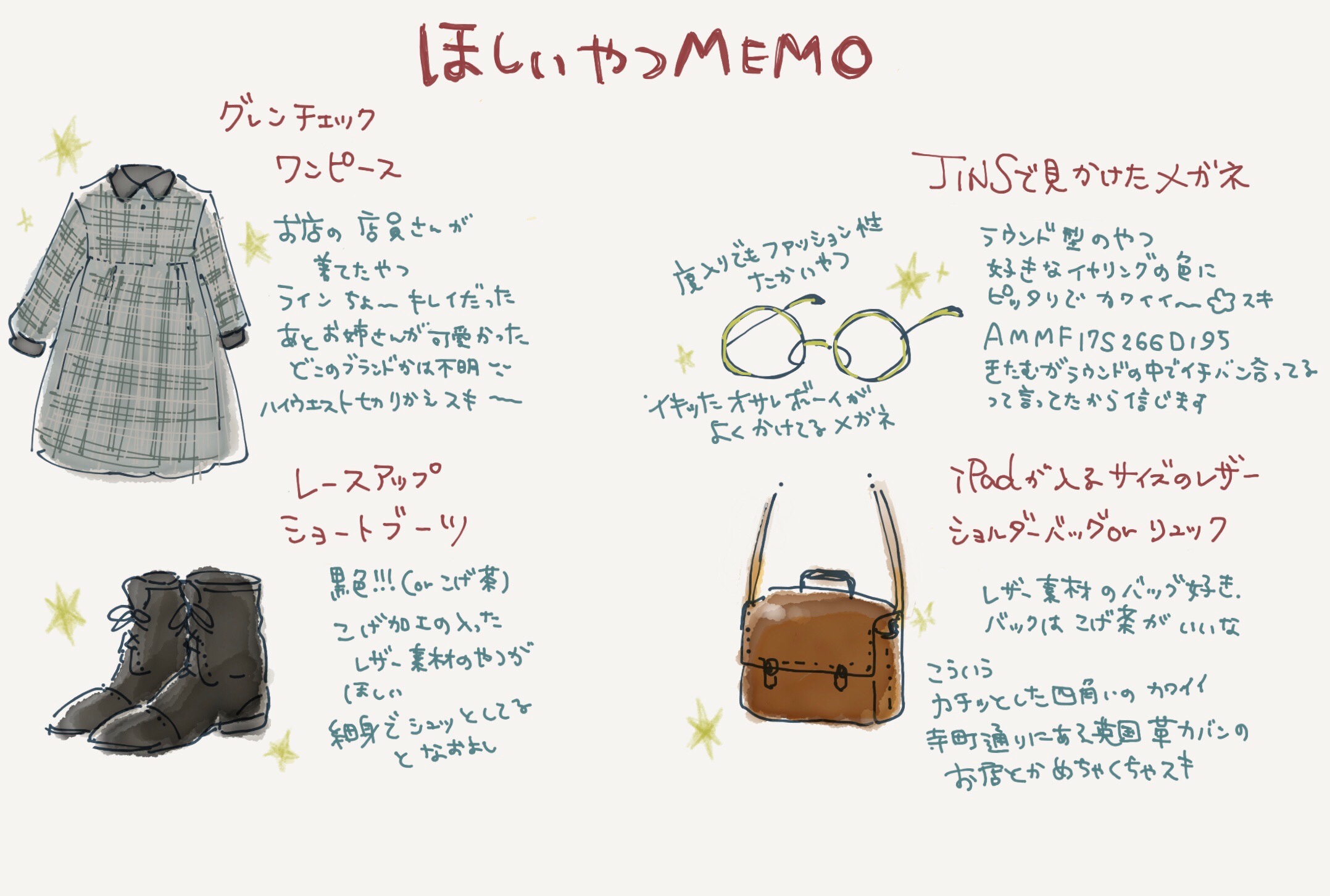 とりあえずJINSで見かけたラウンド型の眼鏡と革鞄は無事理想的なものを見つけられたのでゲット致しました!