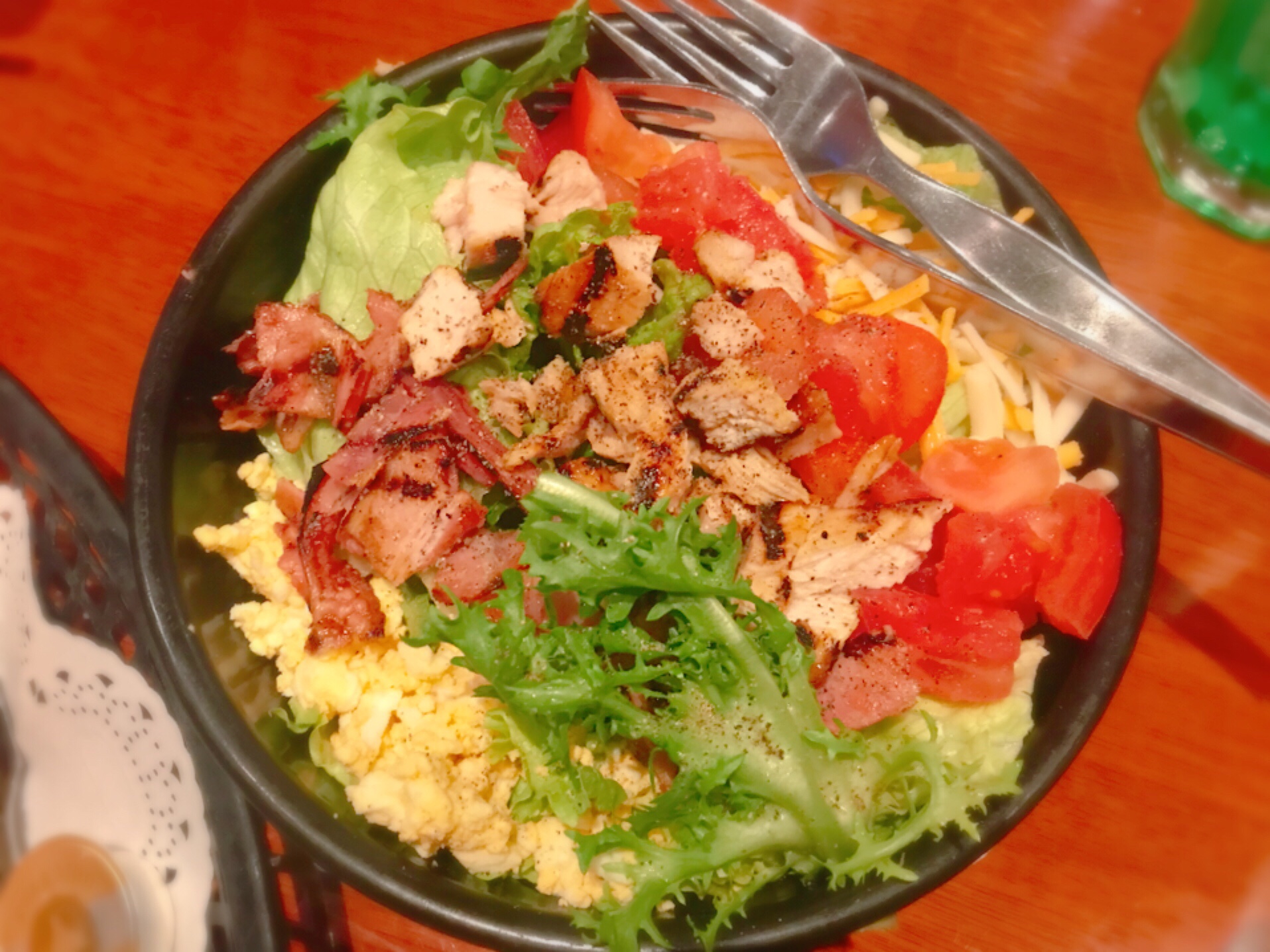お姉様と頼み過ぎないようにしようということで、コブサラダとリブロースステーキを注文!