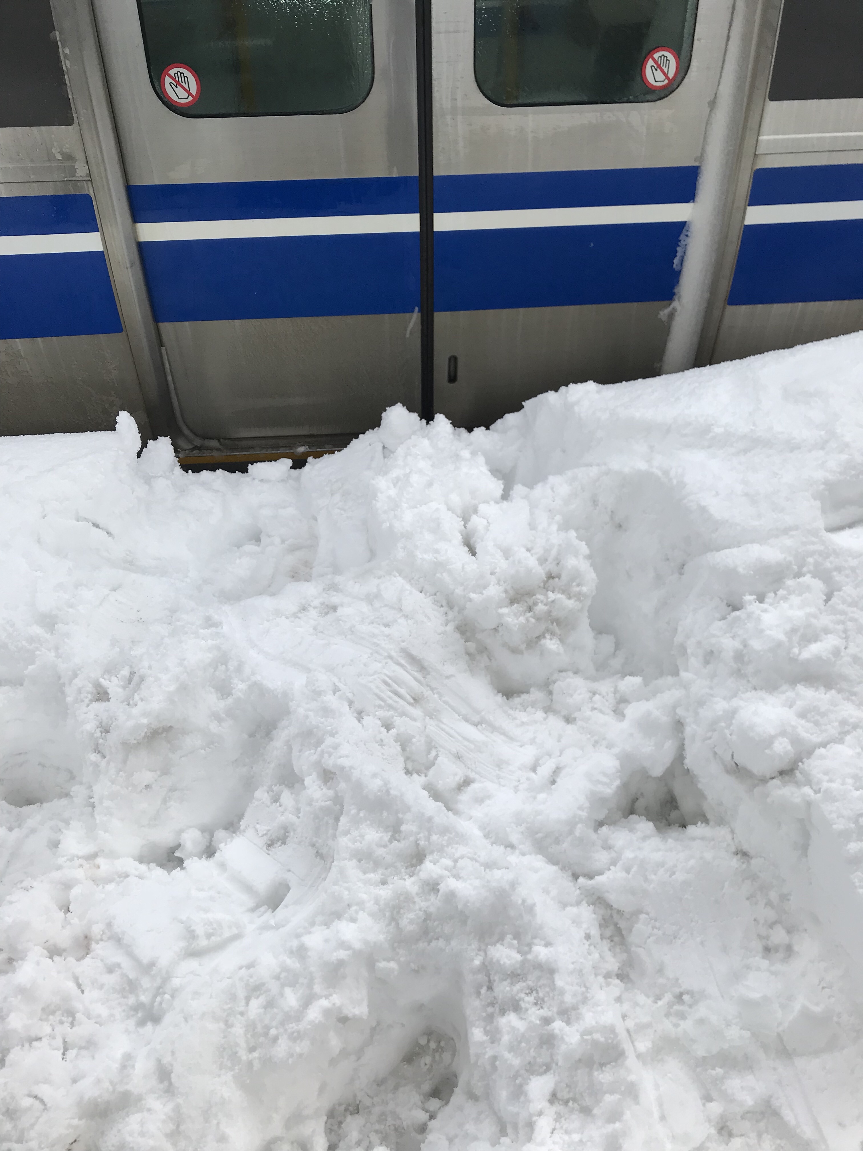 ↓電車から降りれないくらいの積雪に、雪国初心者の私は心が折れそうでした。