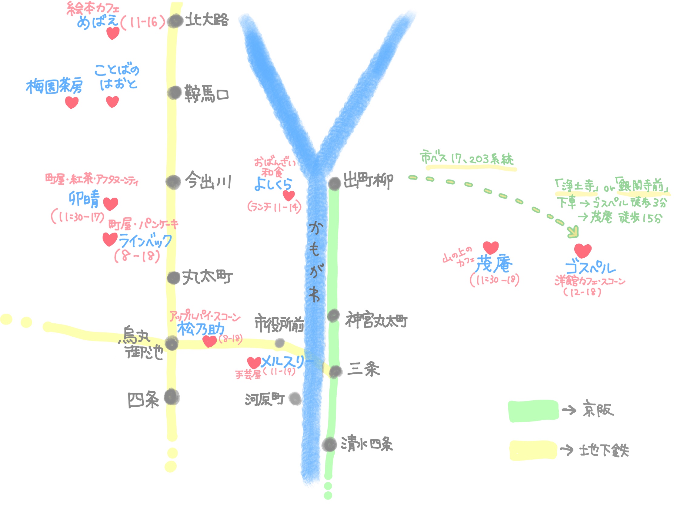 今回の一番の目的は銀閣寺近くにあるカフェ ゴスペルさんだったので、その近辺で出町柳〜河原町あたりまでマップにして、その中からどこに行くか、どう回るかを話し合いました…カフェ巡りに全身全霊挑む女たち……