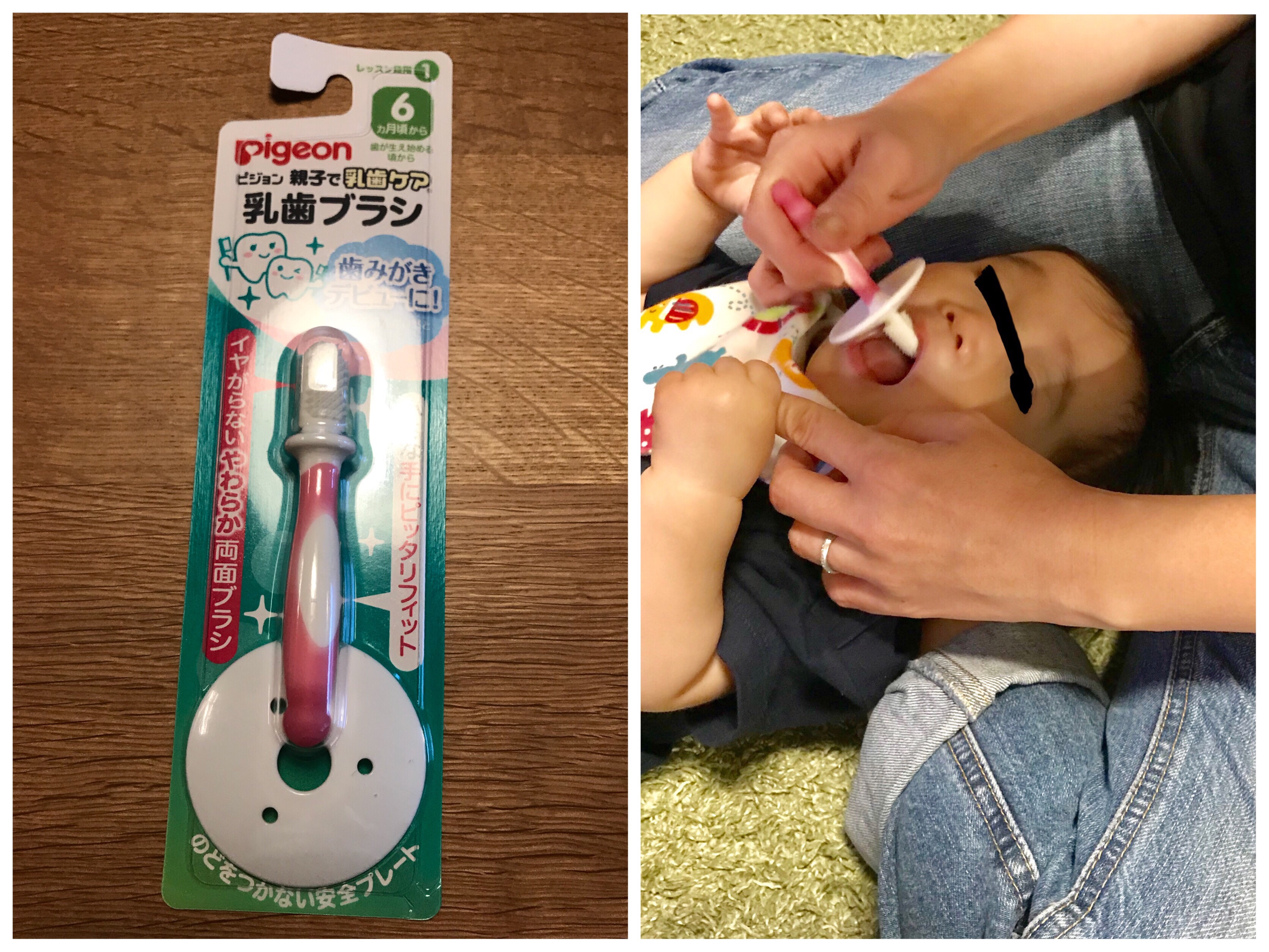 まだ下の前歯一本だけなので、歯磨きをしないとと言うわけではありませんが、歯磨きをさせてもらう準備段階として、何か口にいれさせてもらえるようにこんなものを使って遊んでいます。
