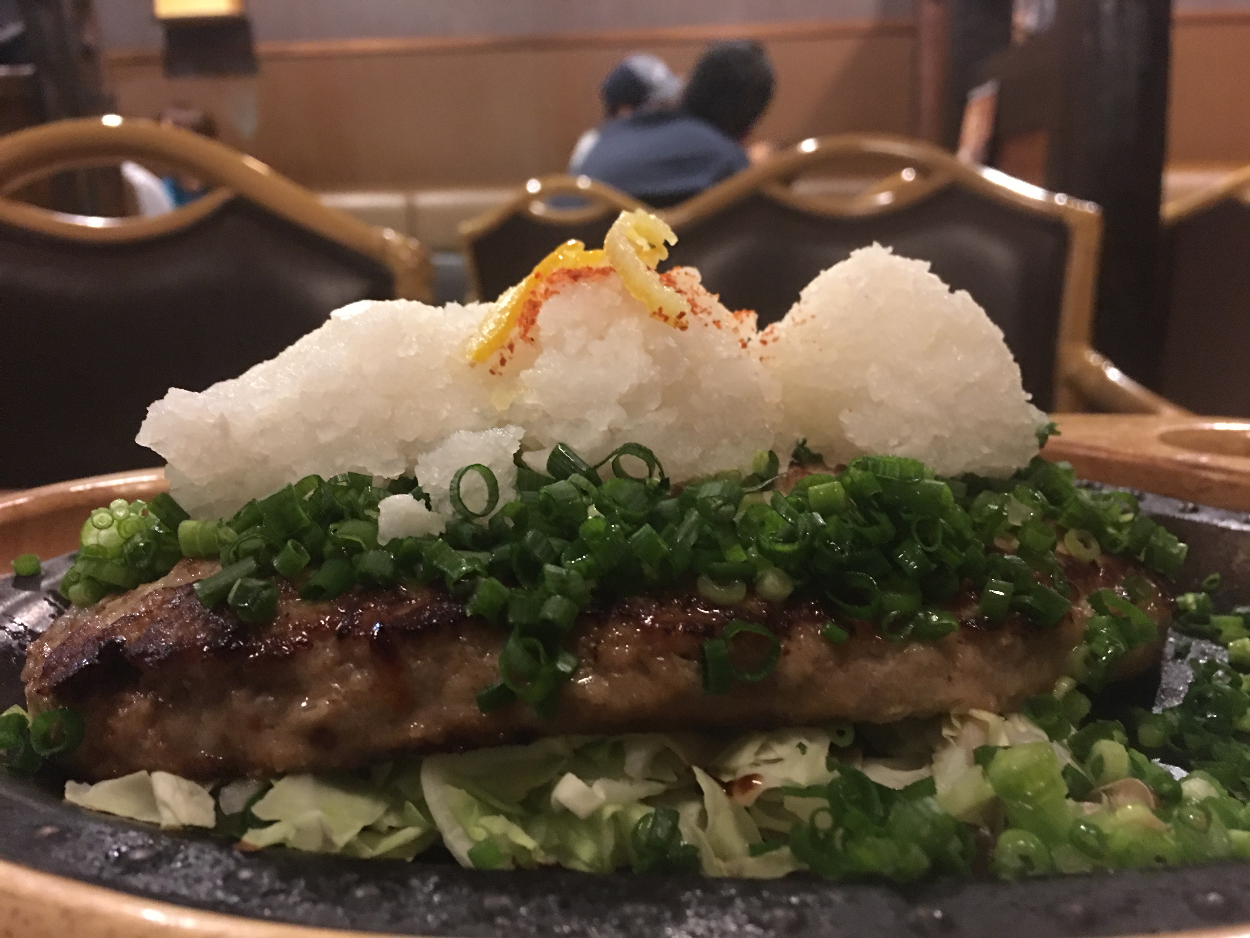 鉄板皿の上ぎっしり、野菜onハンバーグonネギonおろし。という光景にびっくりしました。流石にライスは頼まず、ひたすらハンバーグ食べておりました。
