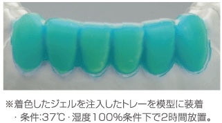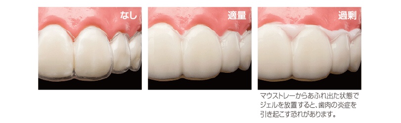 このホワイトニングジェルの特徴は、唾液(つば)に溶けない、垂れない、よく伸びるジェルだそうです。ホワイトニングジェルが唾液に溶けにくく、歯にしっかり密着して広がり留まるので、トレーを装着した時に歯にムラなく有効成分が作用するそうです。