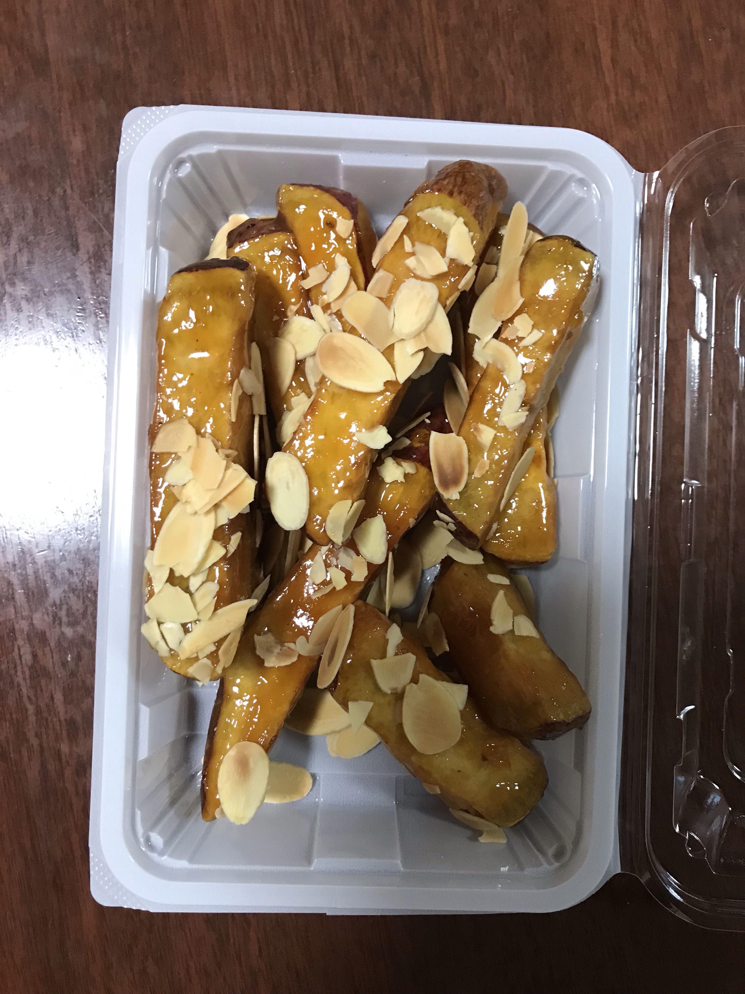 そのお芋をかりっとしたアメの食感と、さつまいものホクホクとした食感、トッピングにアーモンドがまぶされており、香ばしい味わいと食感がくせになるおいしさです。