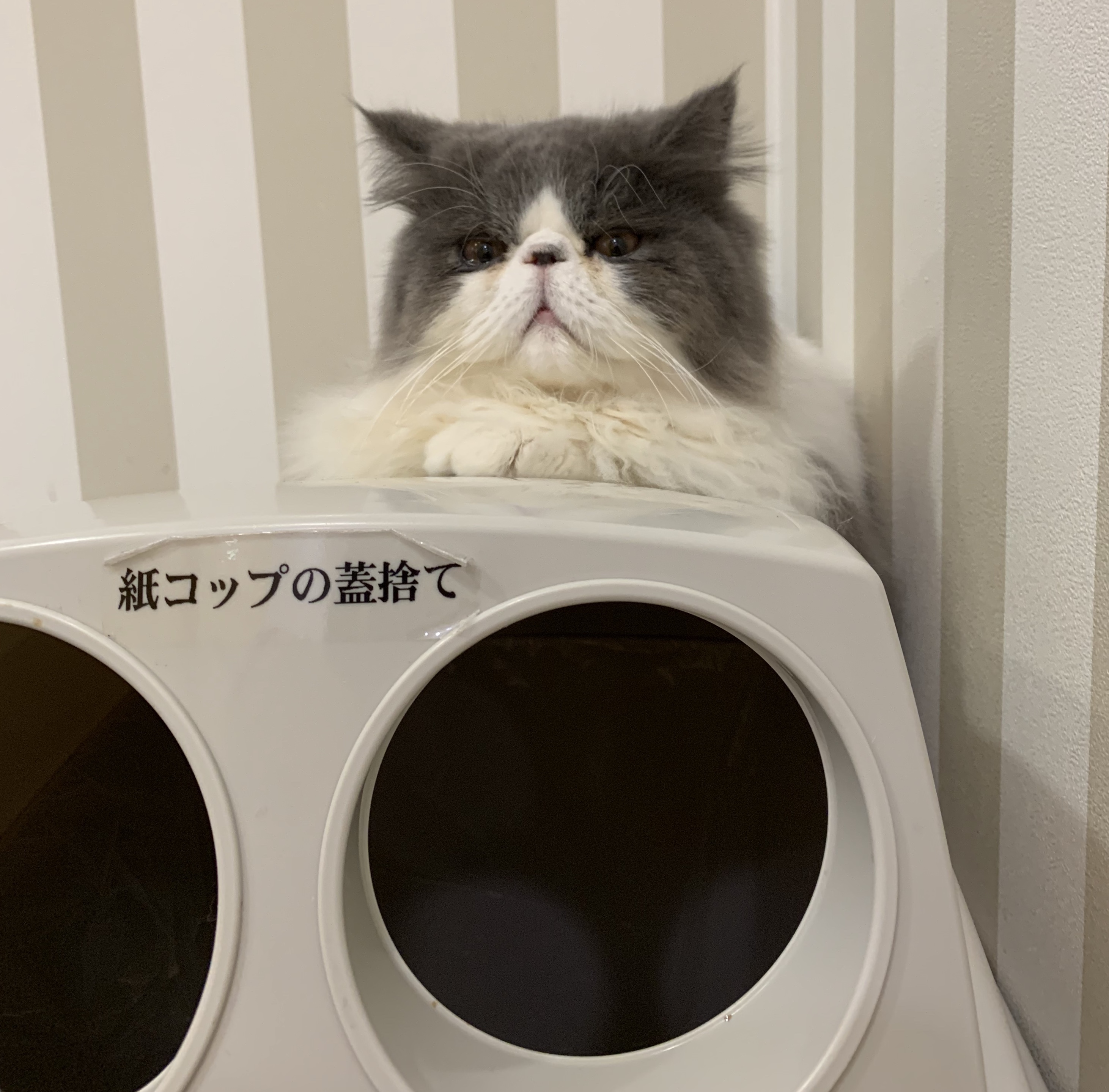 ゴミ箱の蓋の上でくつろいでおりました。