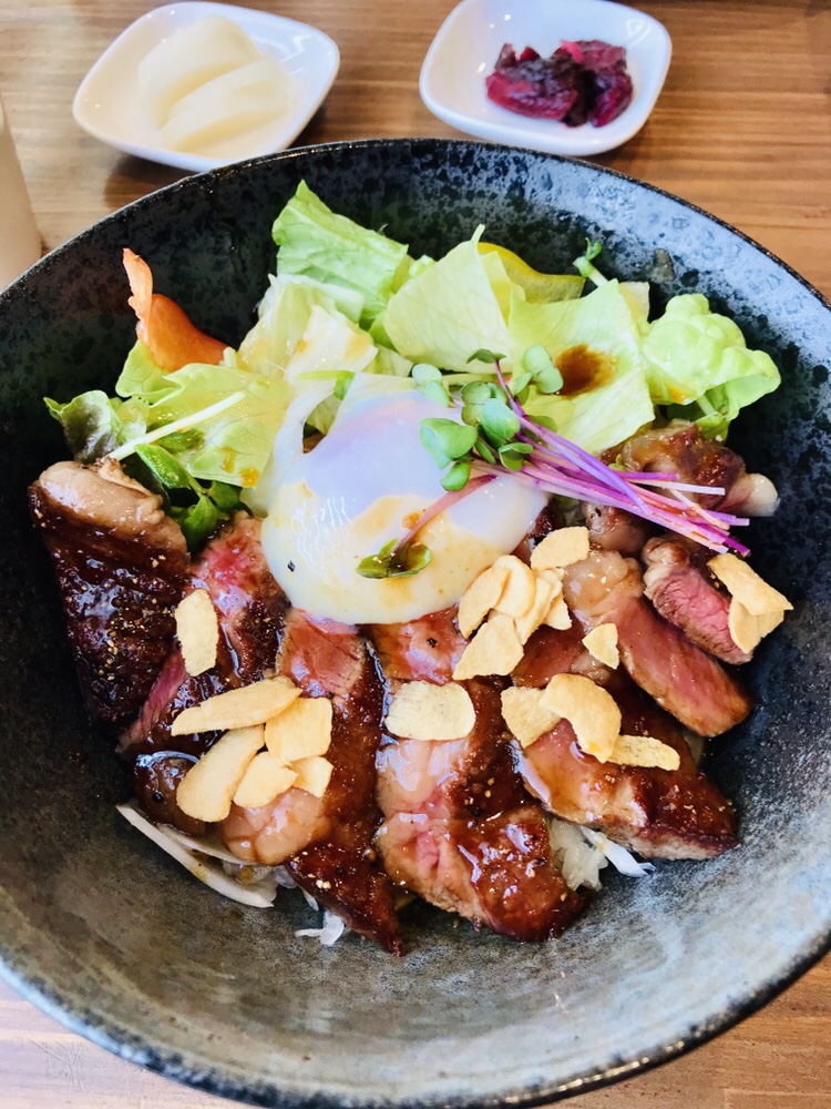甘辛いステーキソースが絡められたステーキがごはん上にドーン!半熟卵にニンニクチップがのっていて、かなり食べ応えのある見た目でした。