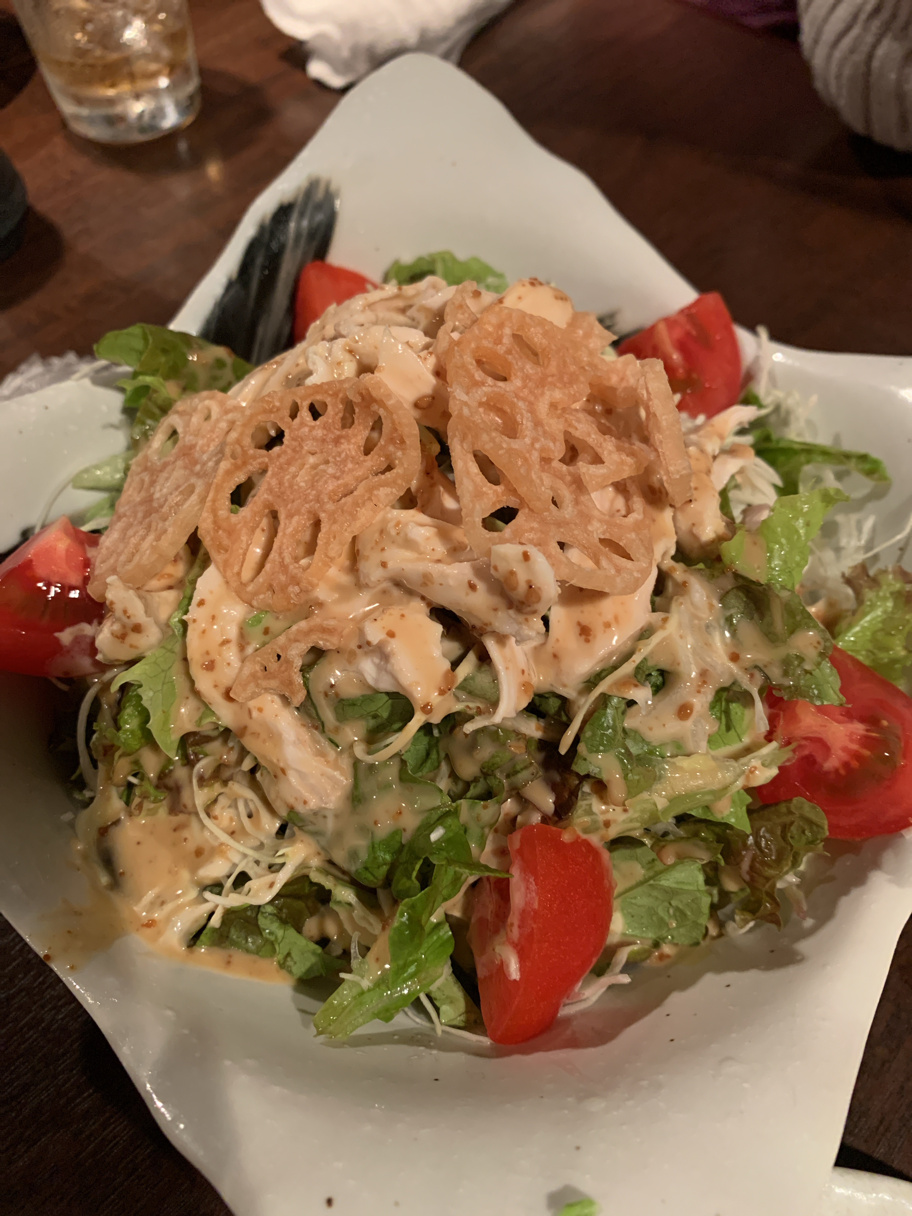 サラダにはチキンも入っており、レンコンチップスもカリカリしてて美味しかったです。