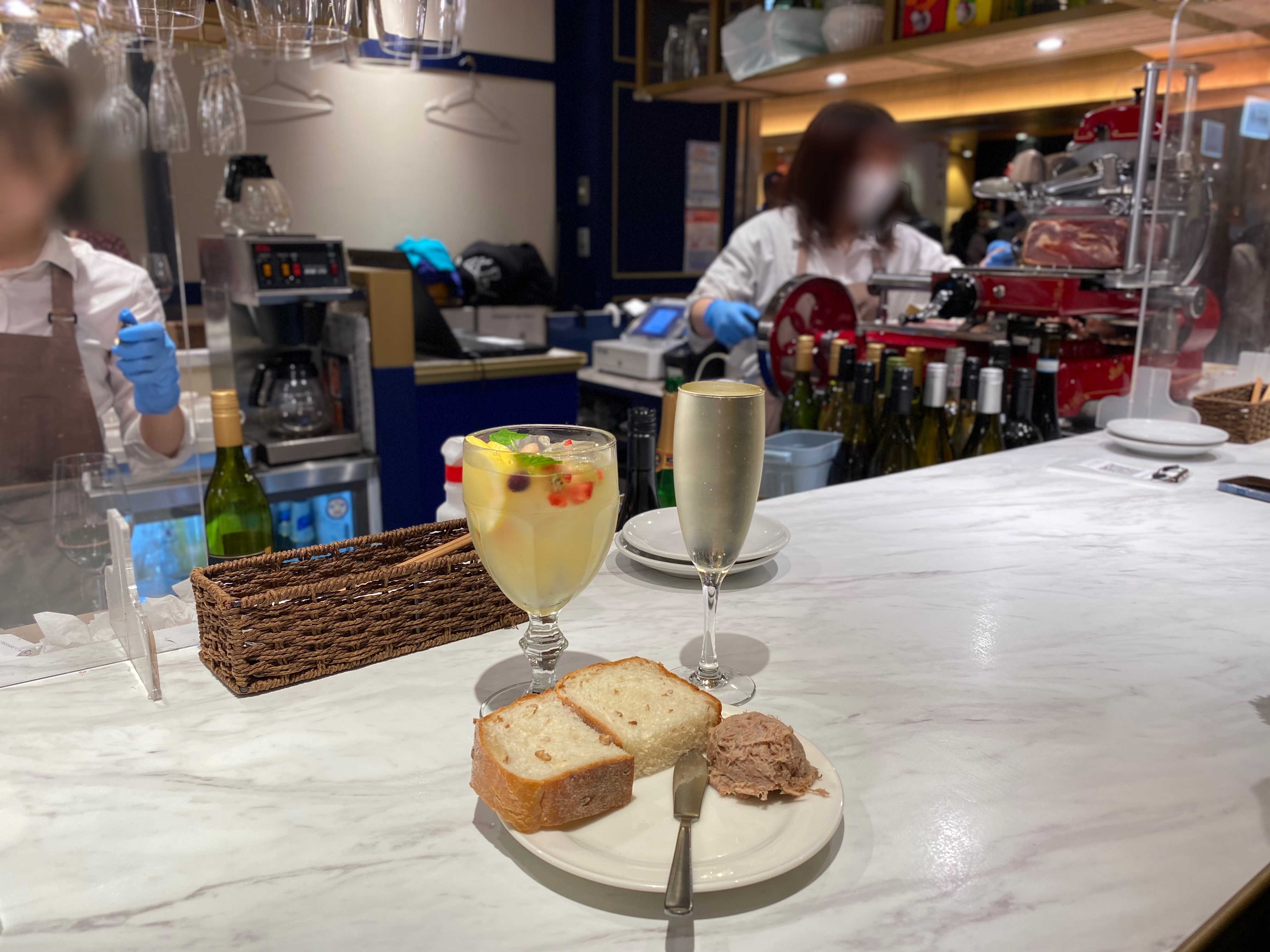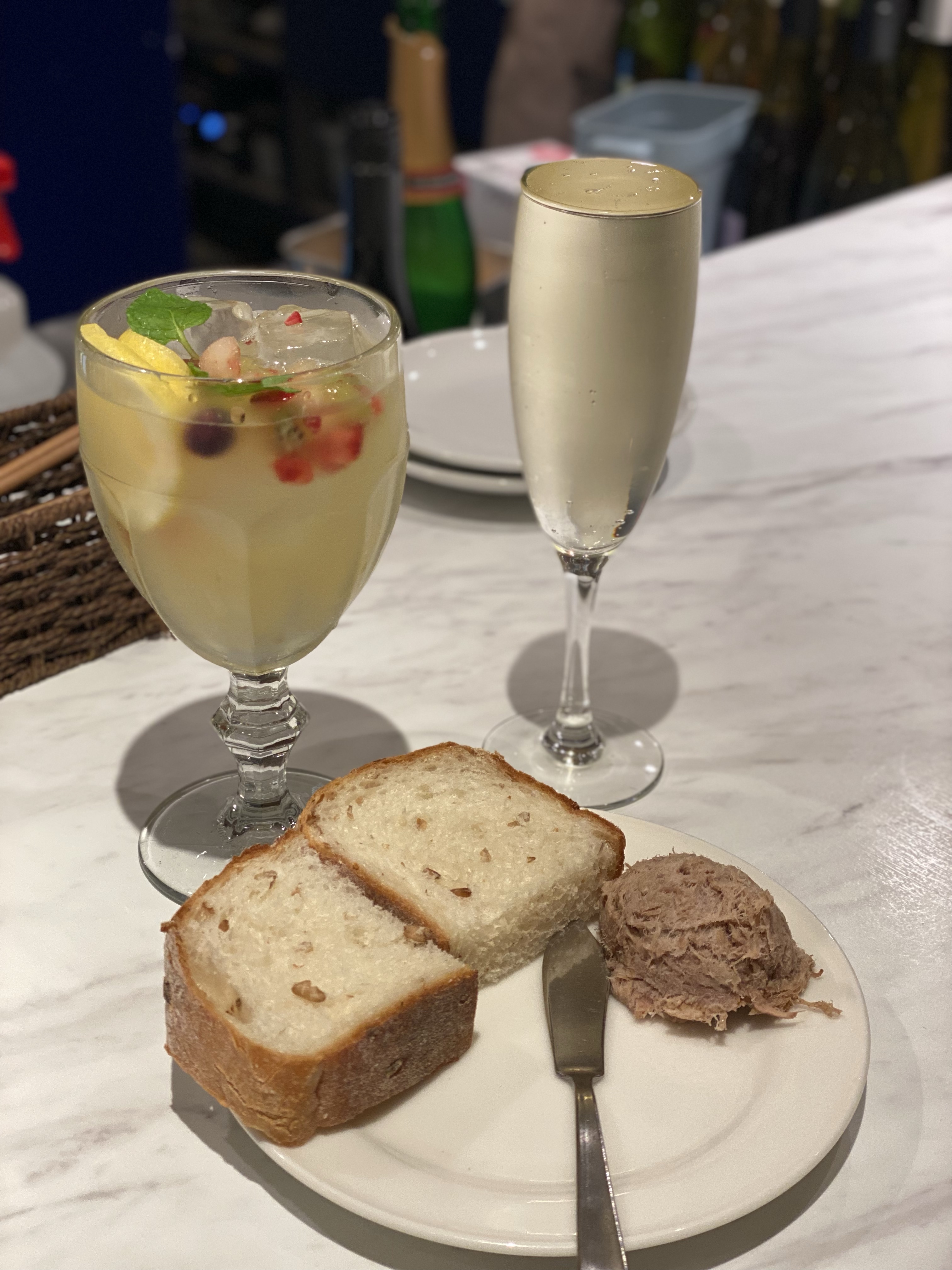 お通し?もめちゃお洒落でバゲットみたいなのとお肉?ツナ?みたいなペーストを出してもらいました!超美味しい
