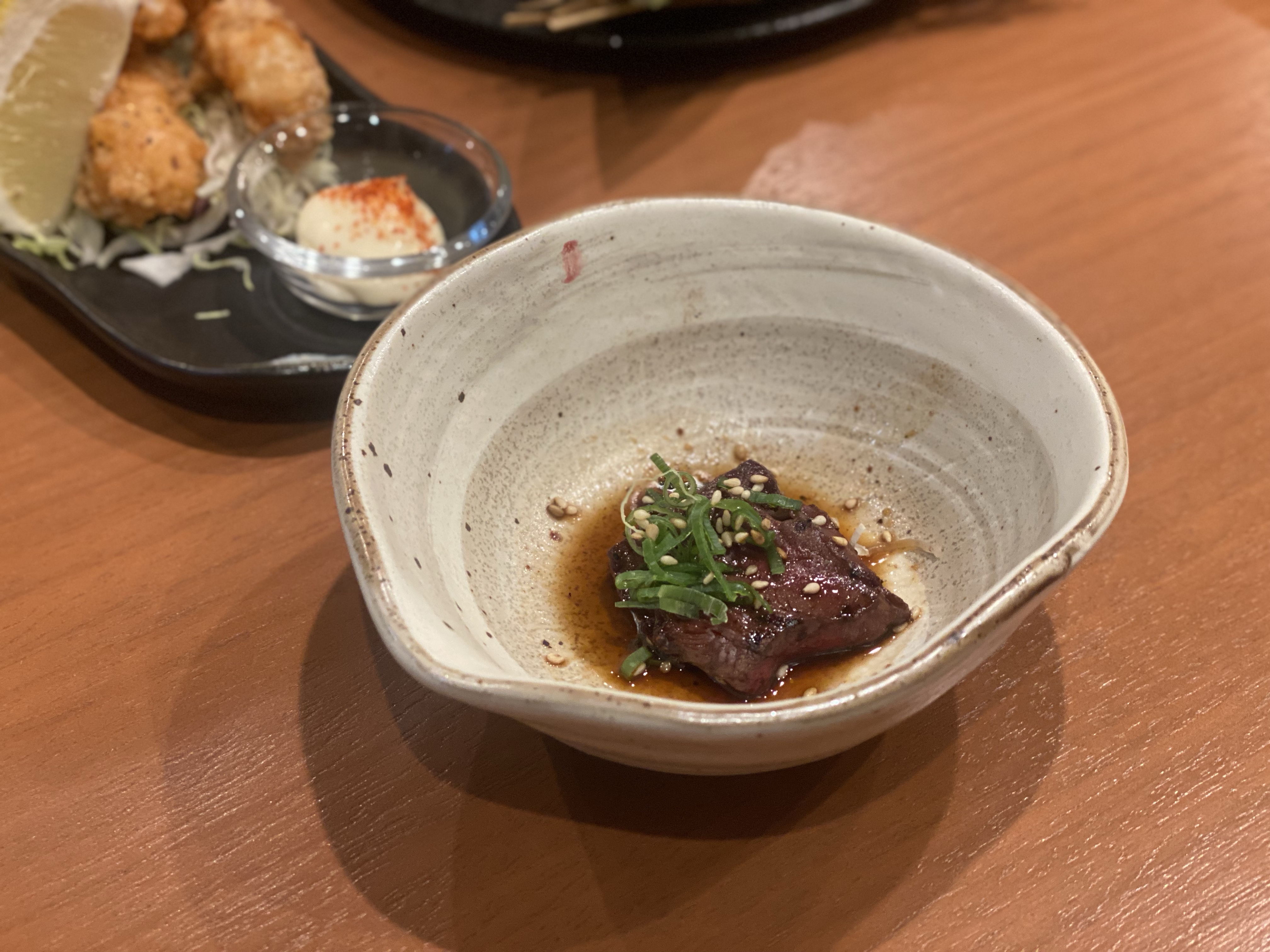 ハツをお店オリジナルのタレでいただくシンプルなお通しですが、これがめちゃくちゃ美味しくて序盤から笑いました