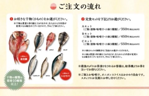 ランチの時間帯に行ったのですが、こちらのお店ではショーケースに入った魚のヒモノから、自分の好きなお魚を選び、ランチセットの副菜を選ぶという注文方法になります!