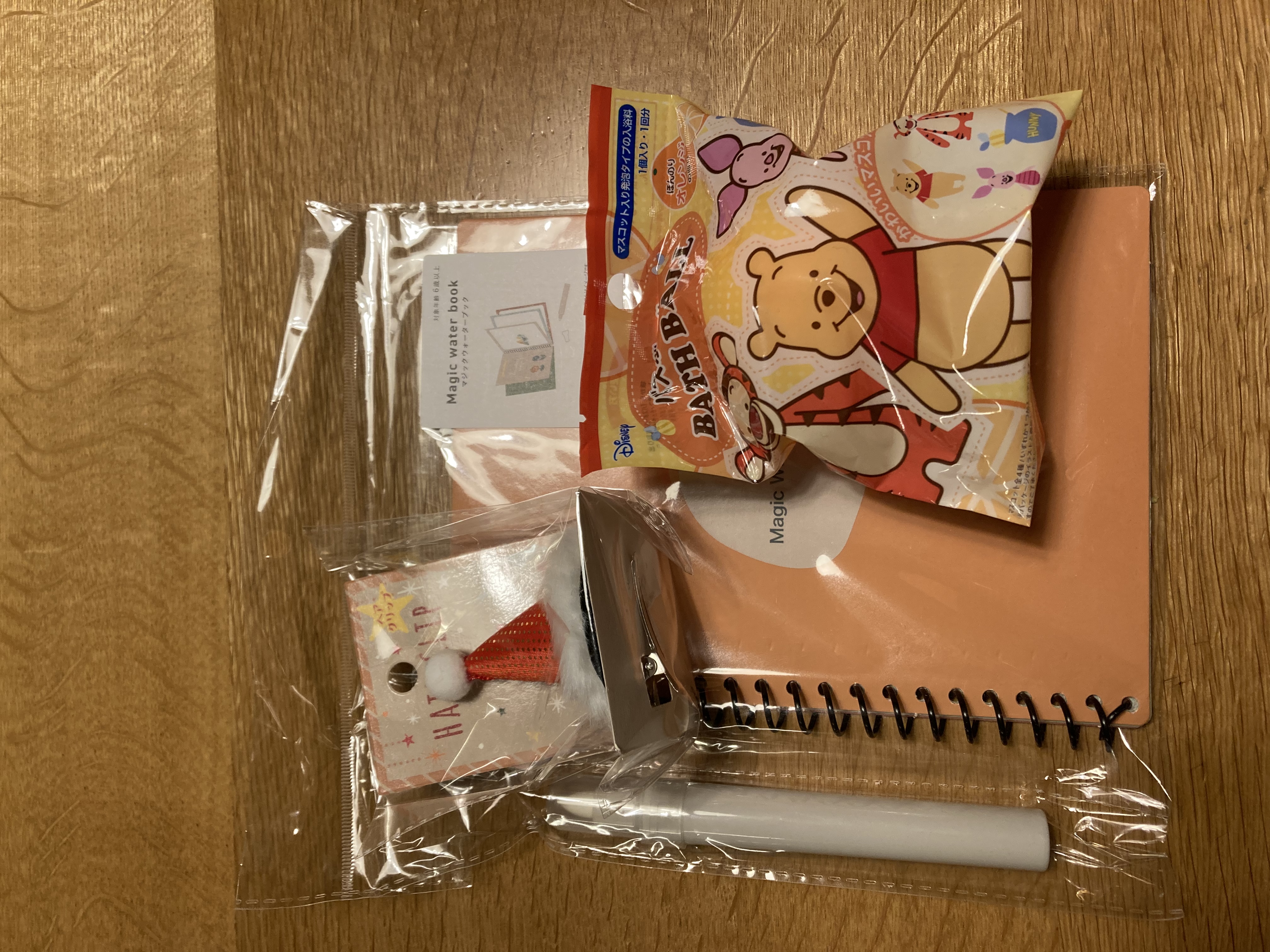 3coinsでセールになっていた、水を入れた専用のペンでお絵描きができるセット、100均で売られてるバスボブ、クリスマスのヘアアクセサリー。