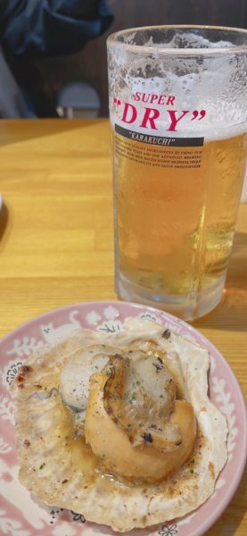 サバをみんなでシェアしながら、父と妹は焼きイカや焼きホタテを食べてました〜〜😊