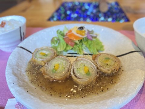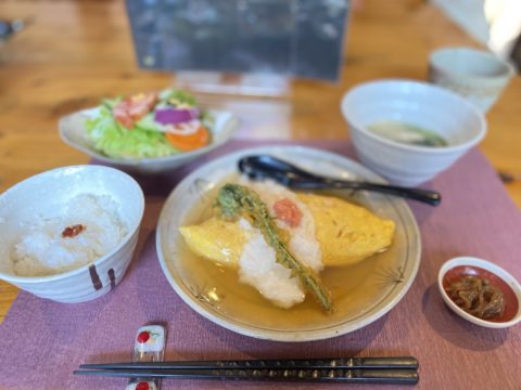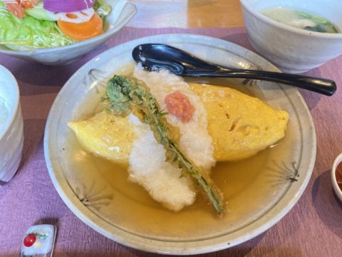 オムレツはとろろと餡もかかっていて、山菜の天ぷらも乗っていました😊