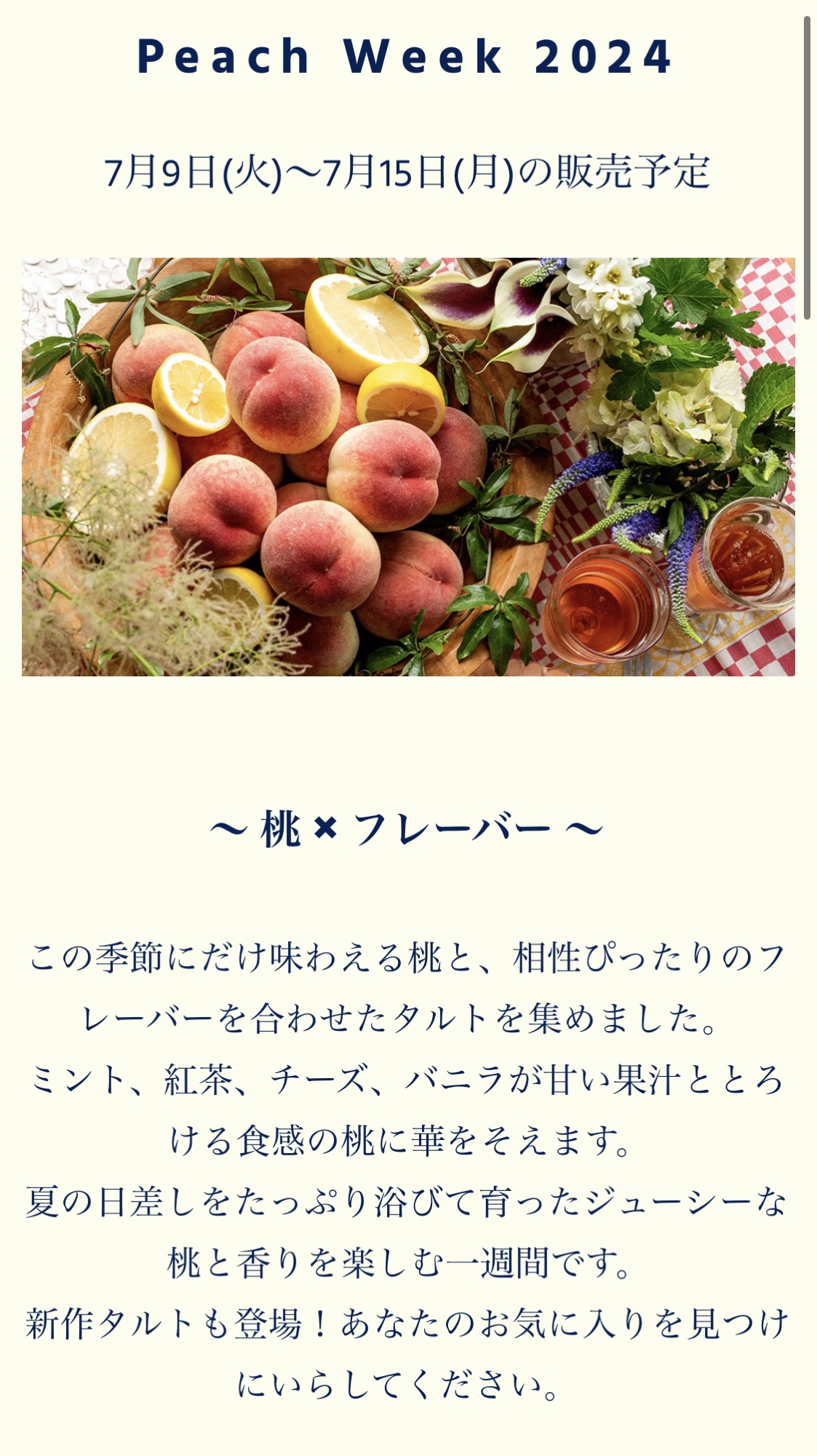 キルフェボンのこのピーチウィークは様々な種類の桃を使って様々なアレンジをされた桃のタルトが食べられる、まさに夢のような週間となってます!