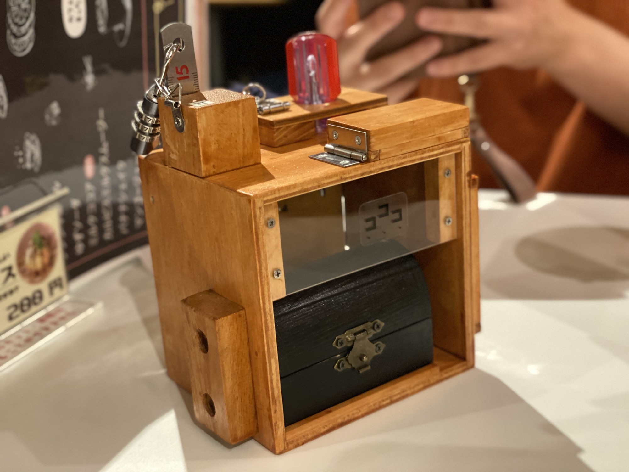 ネタバレ厳禁なので↑の謎解き前の写真しかお見せできないのですが、中にある宝箱をなんとかして取り出したうえで、更にその宝箱の中にある謎を解くような流れになっています