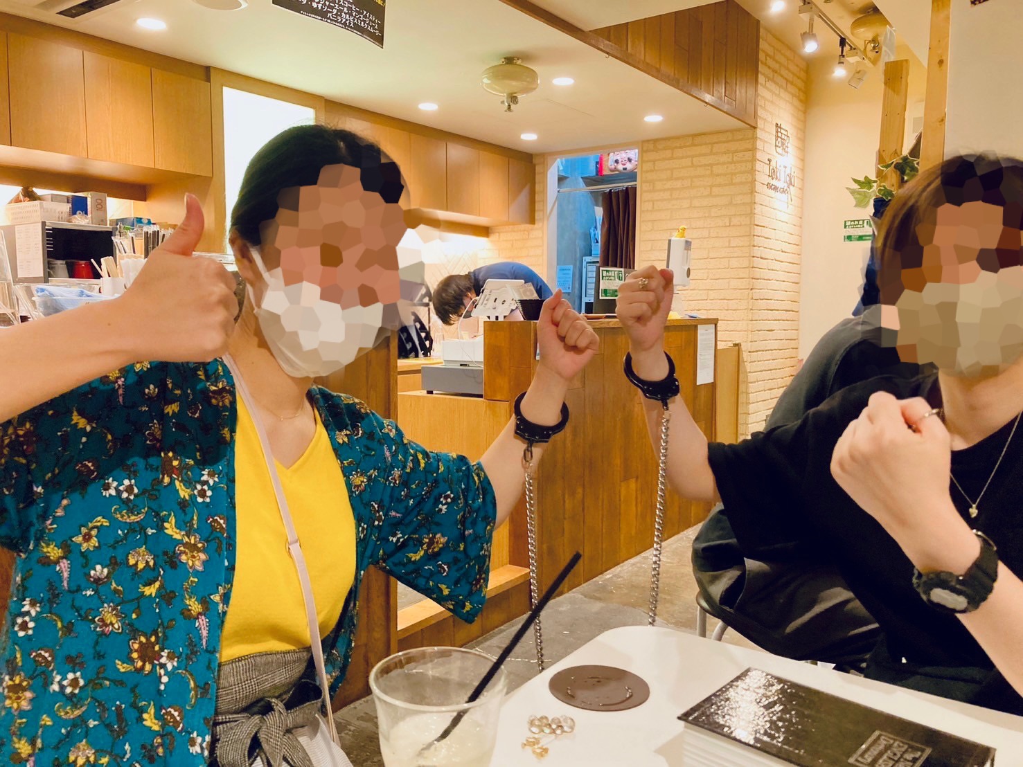ということで(?)プレイ前に店員さんから渡された手錠をつけさせられた私たちの様子です