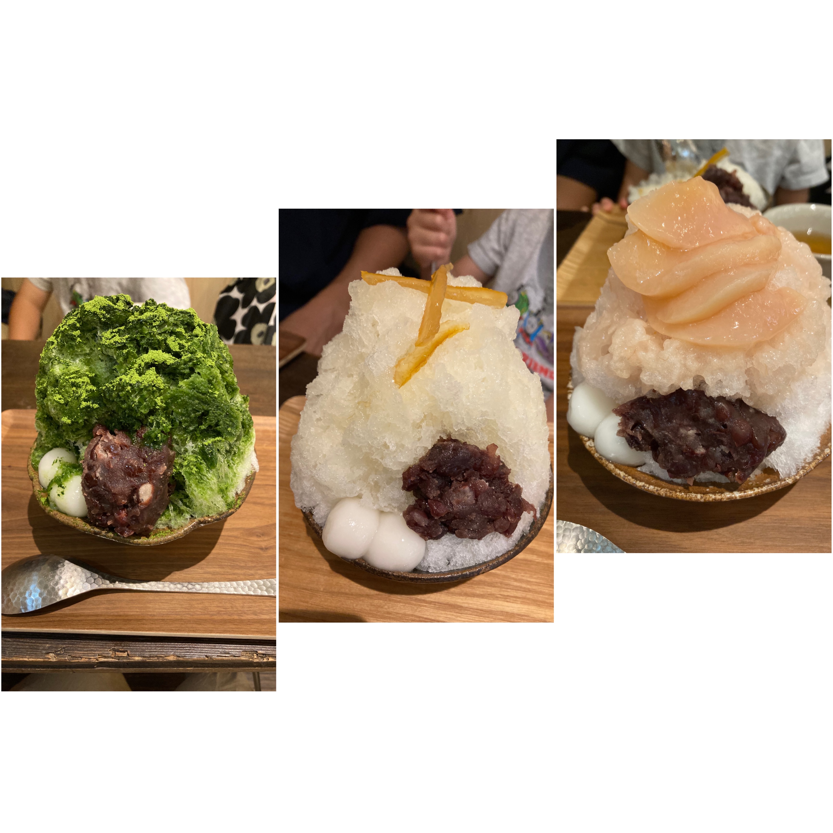 今回は桃、ゆず、抹茶の3種類のかき氷とわらび餅を注文しました。