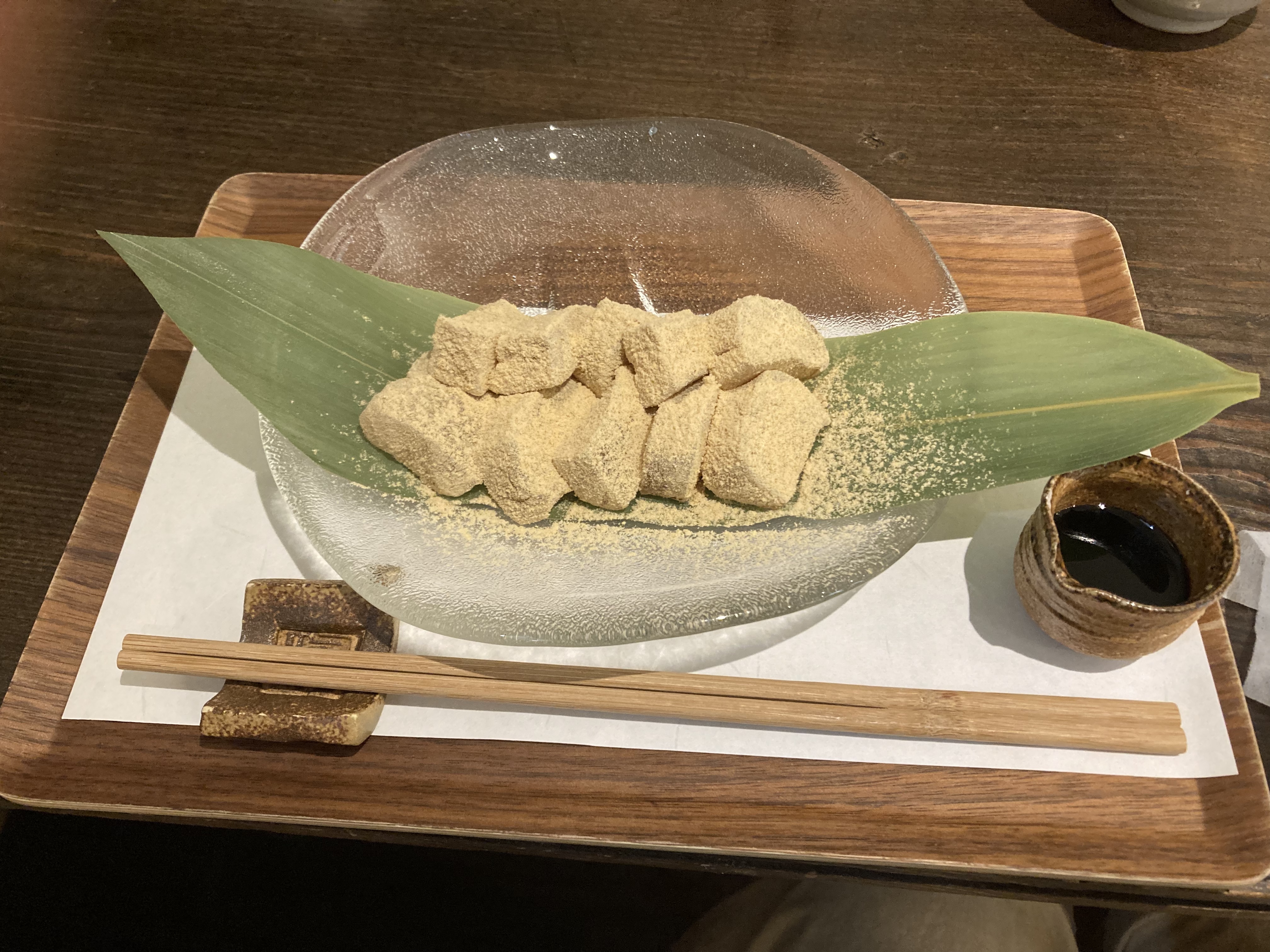 きな粉がまぶされ、お好みで黒蜜が添えられていたので始めはきな粉のみで食べ、後半は黒蜜をかけて食べました。