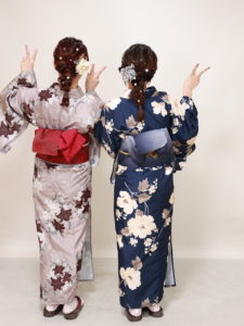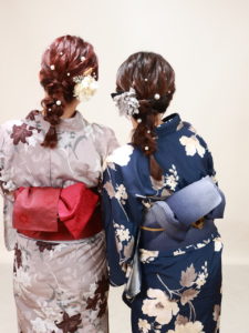 お友達とは双子コーデに近い感じにしたいと話していたので髪型はお揃いで、浴衣の色味は真逆!って感じになりました