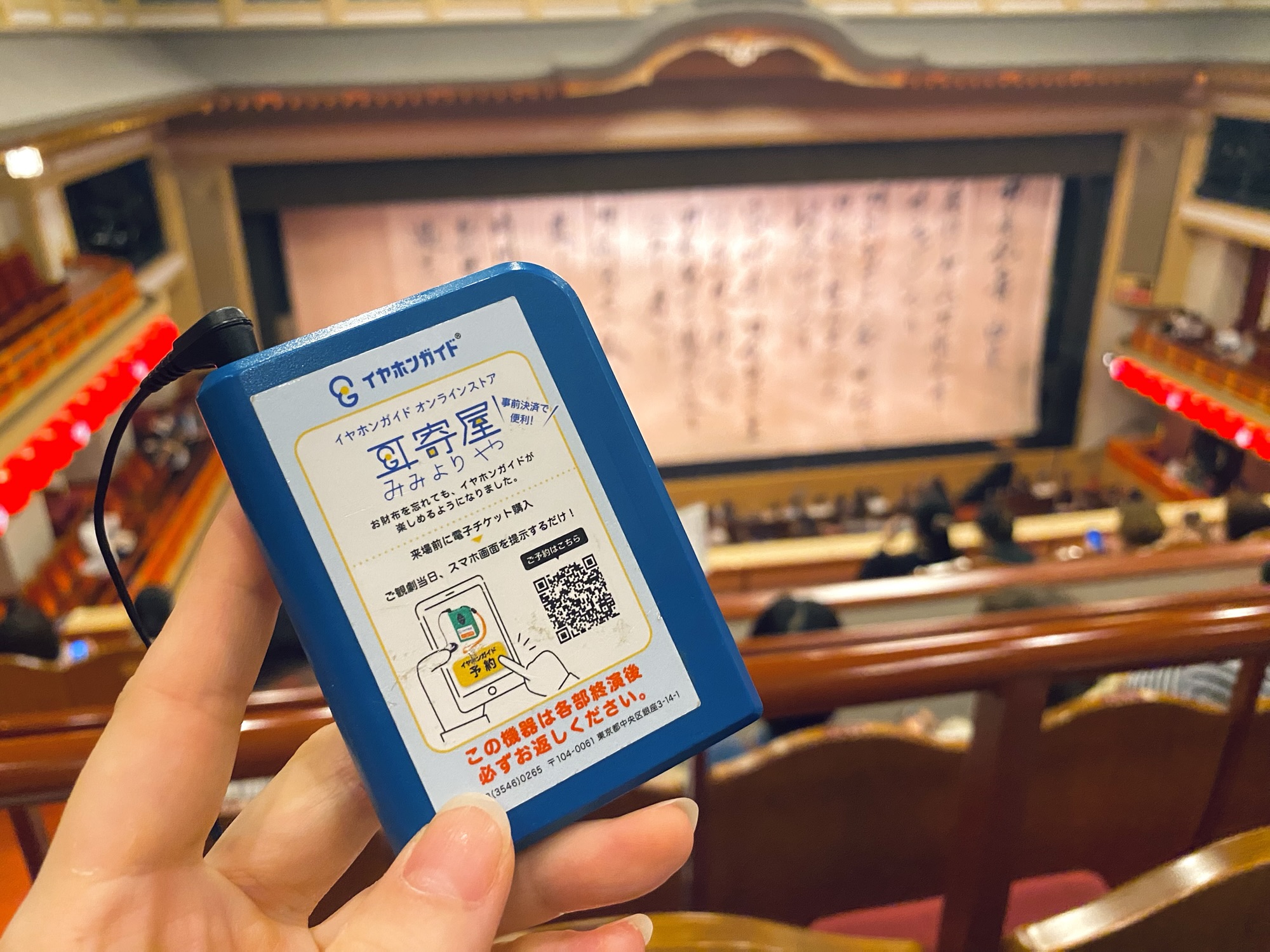 片耳イヤホンのついた受信機になっており、送信者が上演中の場面転換や登場人物のちょっと難しいセリフなどに合わせて解説を流してくれる仕組みになっています😳