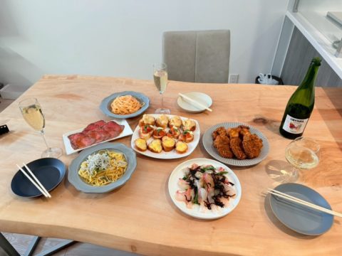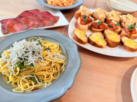 パスタ、バケットのやつ、カルパッチョ、ローストビーフ、唐揚げ、コロッケまで!!!