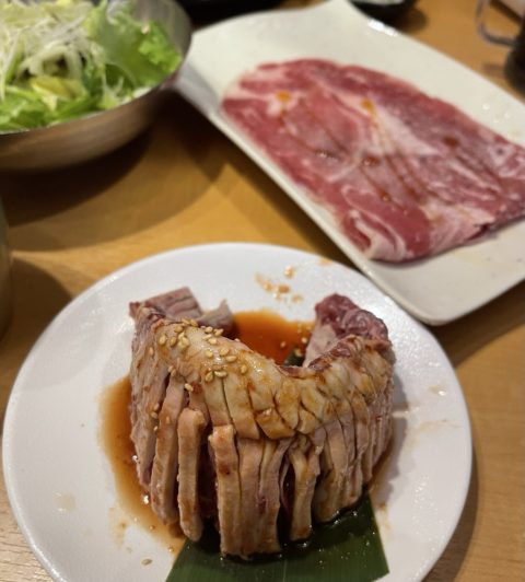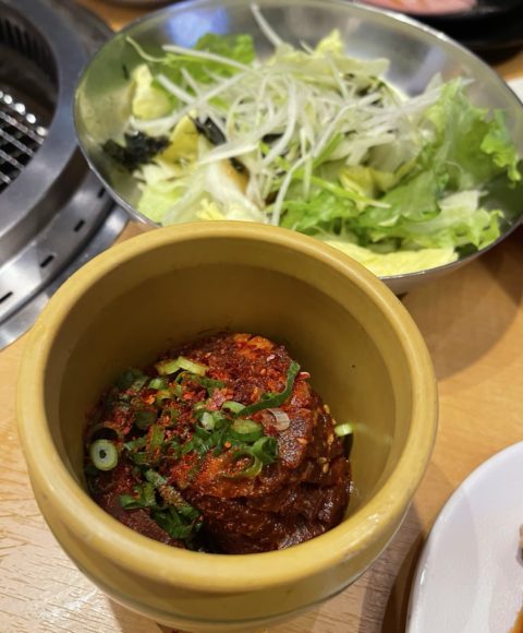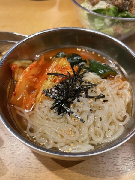 写真の後ろの方に写っている野菜はチョレギサラダなのですが、海苔がめちゃくちゃたっぷり入っておりドレッシングも美味しいので2回ぐらい注文して1人で食べきりました!